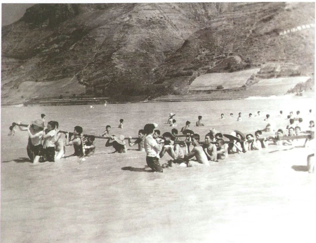 ▲二汽职工在汉江中抢运钢材