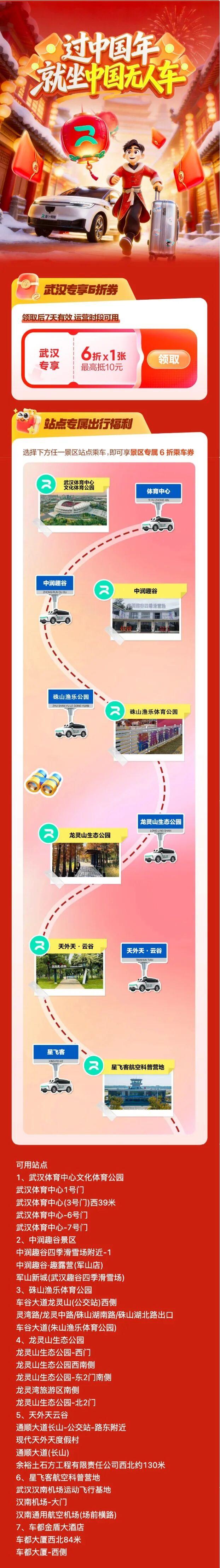 1.乘车福利:活动持续至3月3日,期间可领取萝卜快跑专属6折乘车券,往返7大景区均可使用,解锁智能出行新体验;