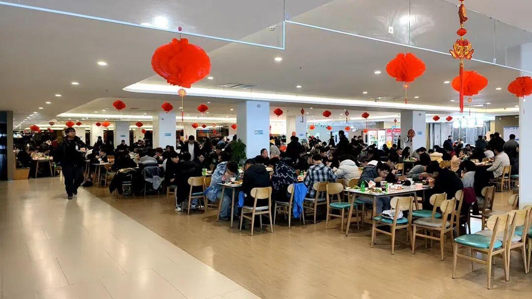 ▲食堂红灯笼、中国结、马年主题装饰错落有致。