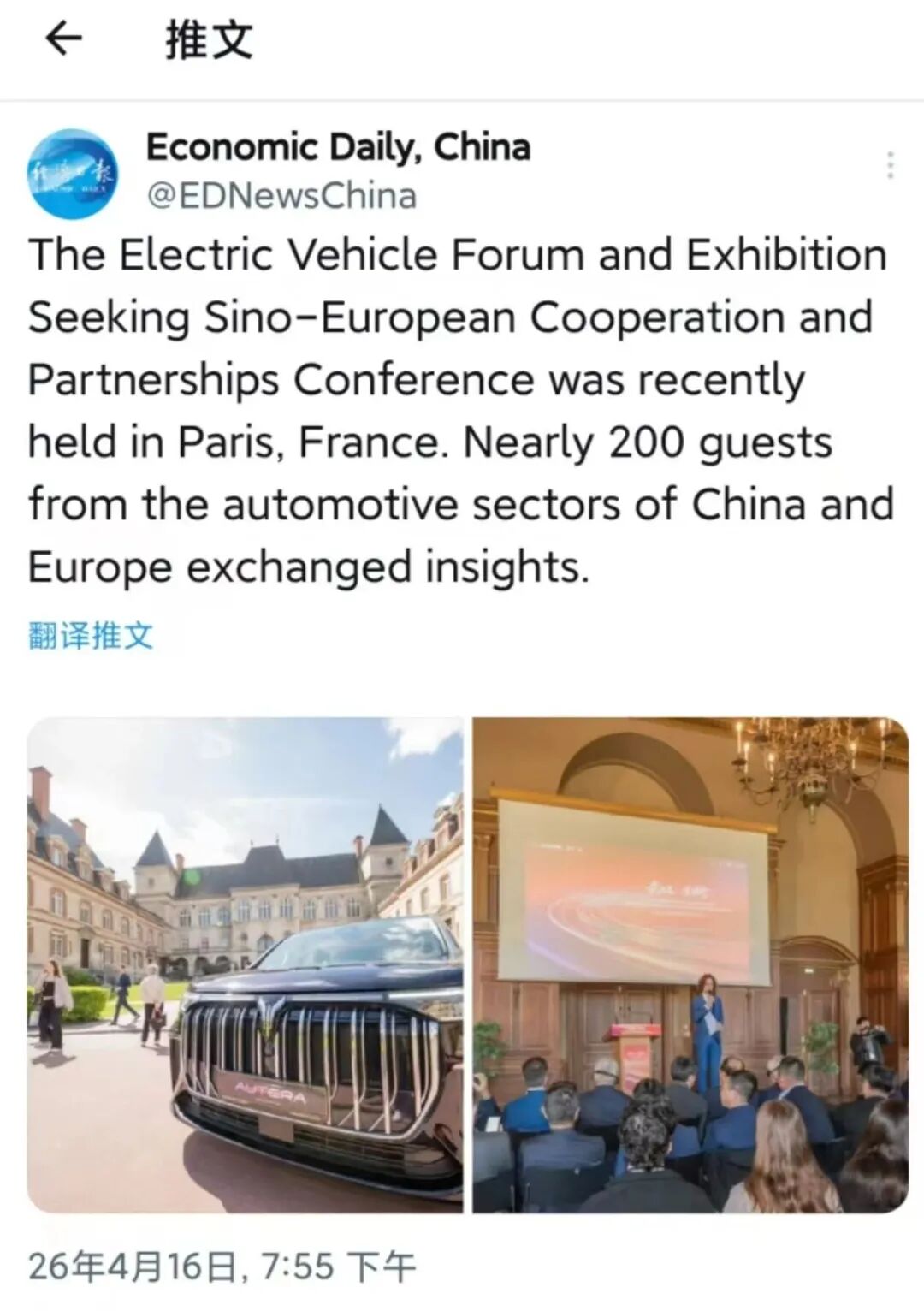 国内权威媒体海外渠道也纷纷发声。《经济日报》海外平台发文关注中欧产业合作,并推介“武汉造”汽车;《中国日报》官网首页推送活动报道;新华社旗下专注国际新闻报道的新媒体品牌新华国际,推出“欧中汽车产业界探讨共同推动产业新生态发展”报道;《北京周报》法文版发布“武汉制造”亮相巴黎塞纳河畔消息。