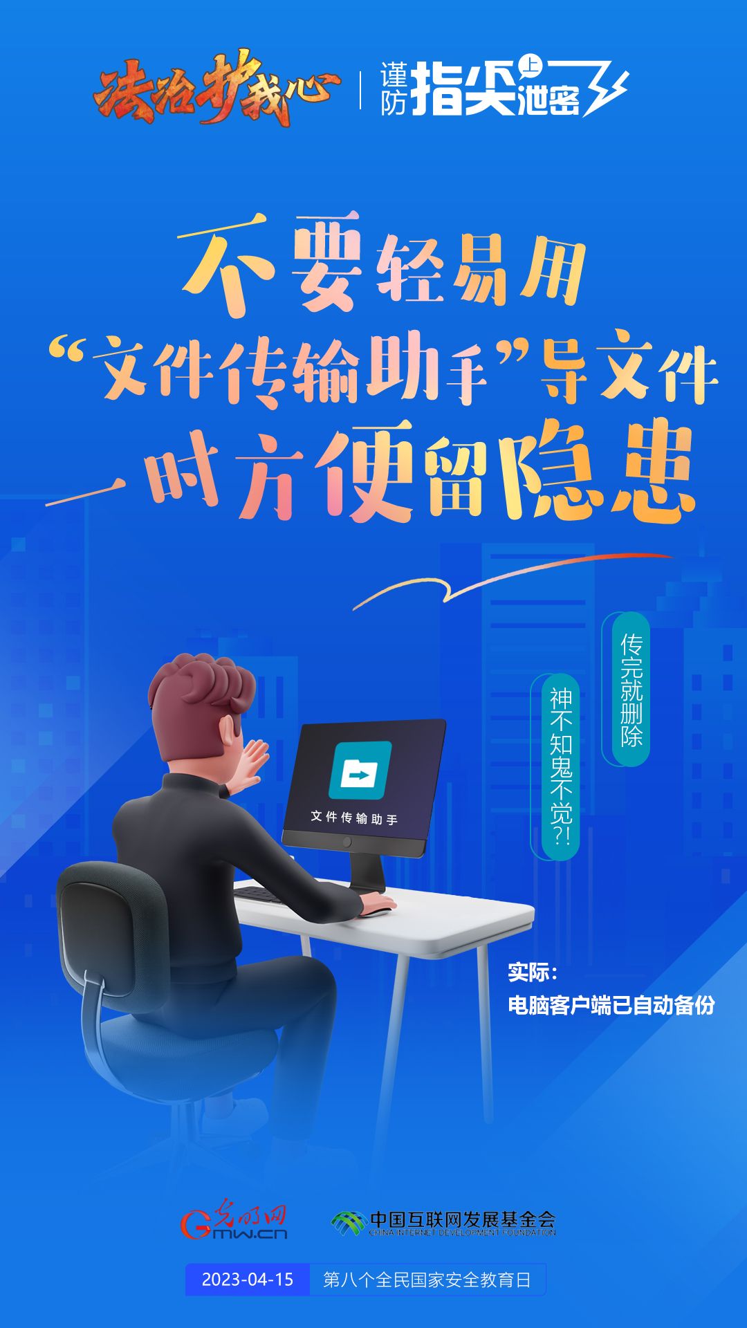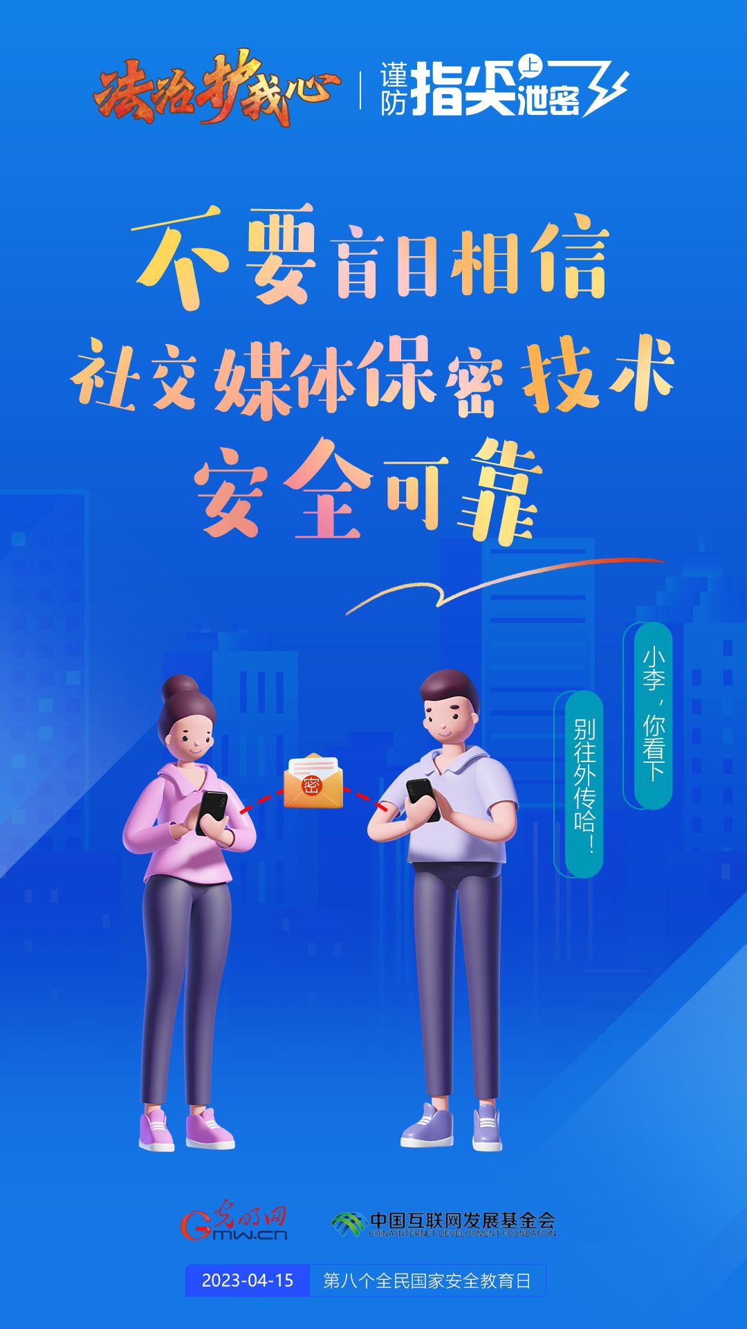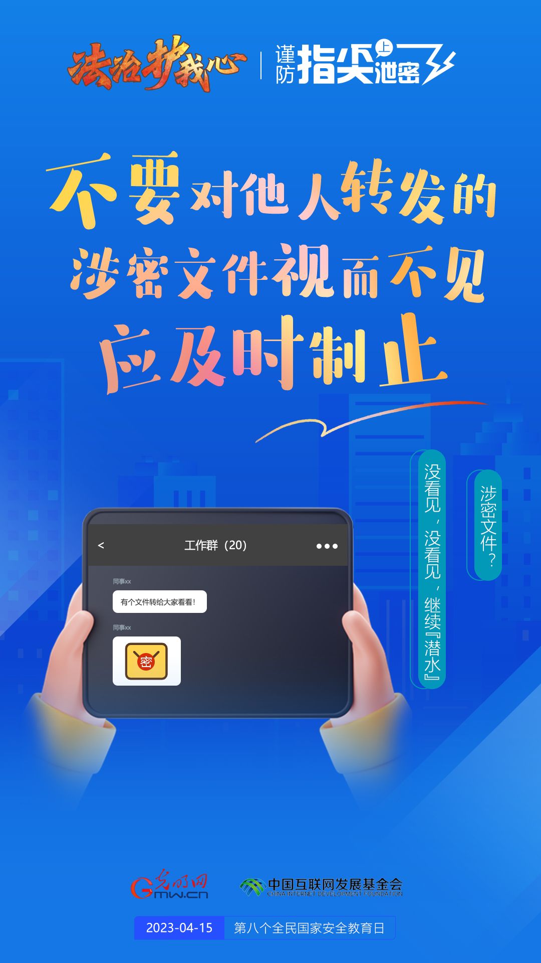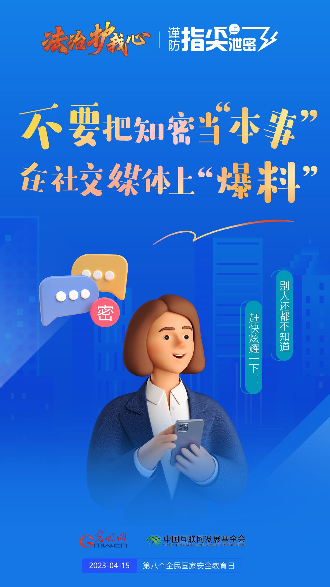 今年4月15日是我国第八个全民国家安全教育日,我们每个人必须从自己做起,谨防指尖上泄密,共同维护国家安全。