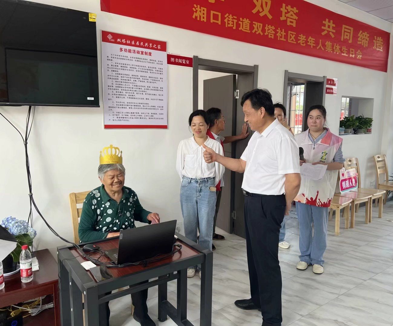 4月20日,双塔社区在“居民共享之家”组织开展以“微孝双塔 共同缔造”为主题的长者生日会活动,活动中,街道党工委负责人和共建单位农发投公司领导一行为30多名老寿星们切生日蛋糕,戴生日帽,齐唱生日祝福歌,并送上最真挚的祝福。社区还通过亲情连线的方式,让何桂英老人与其女儿进行“云上见面”,老人家惊喜又激动。
