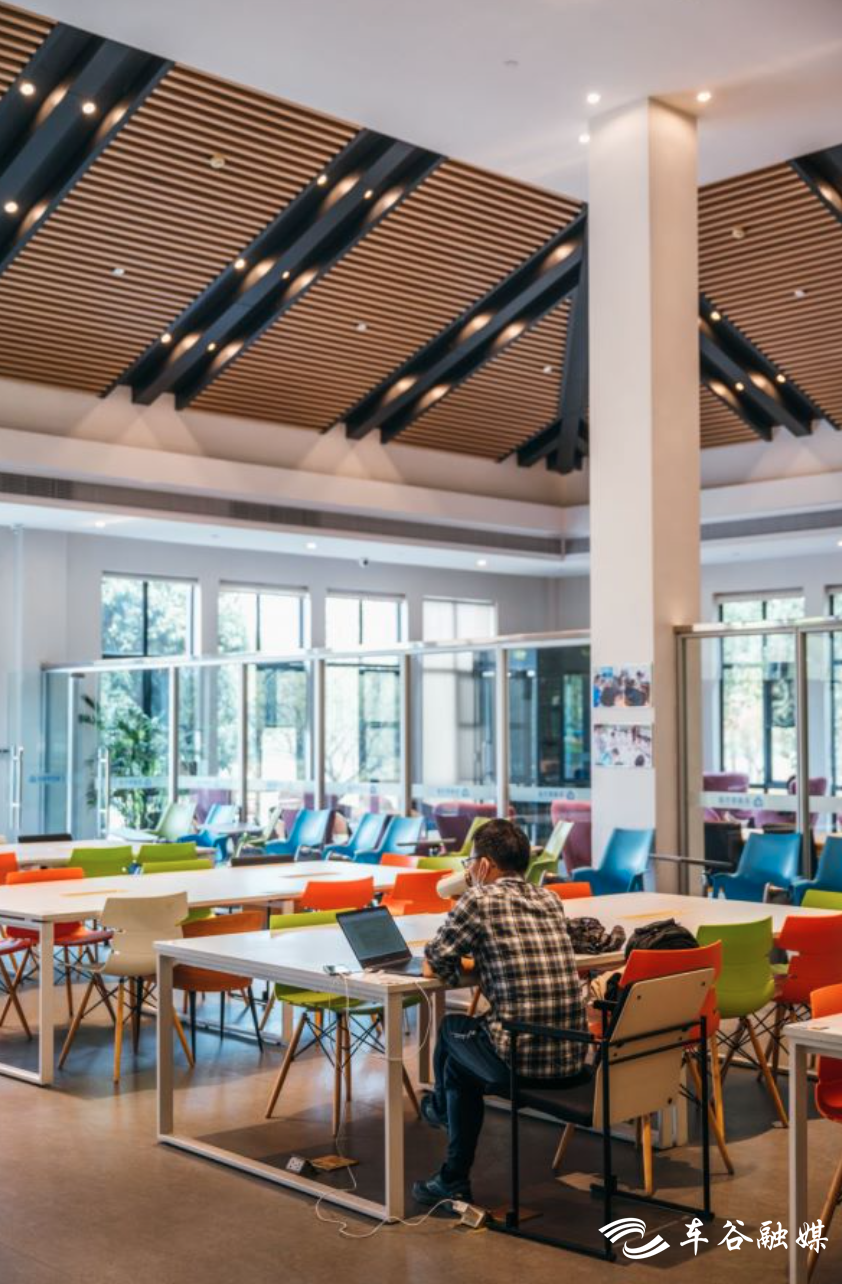 其实,7年前,这里还真是一座工业厂房。在武汉经开区政府的支持下,这座破旧的工业厂房华丽“重生”,已成了高新技术企业集聚之地。下班后,不少人从公司径直走向图书馆,查阅相关书籍、资料,解决工作上遇到的难题;也有人选择拿一本有趣的小说,挑一个舒适的座位,背靠夕阳,在文字的世界里忘记一天的疲惫。