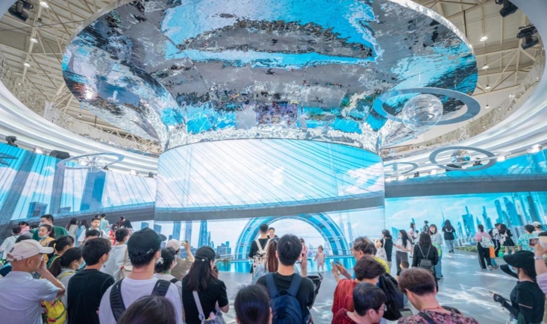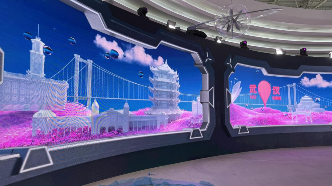 大江大湖武汉馆,外观像一艘银白色的宇宙飞船,通体亮晶晶;馆内270°环绕大屏上,元宇宙城市山水画卷、梦幻樱花雨、梦幻楚城等未来武汉场景扑入眼帘……