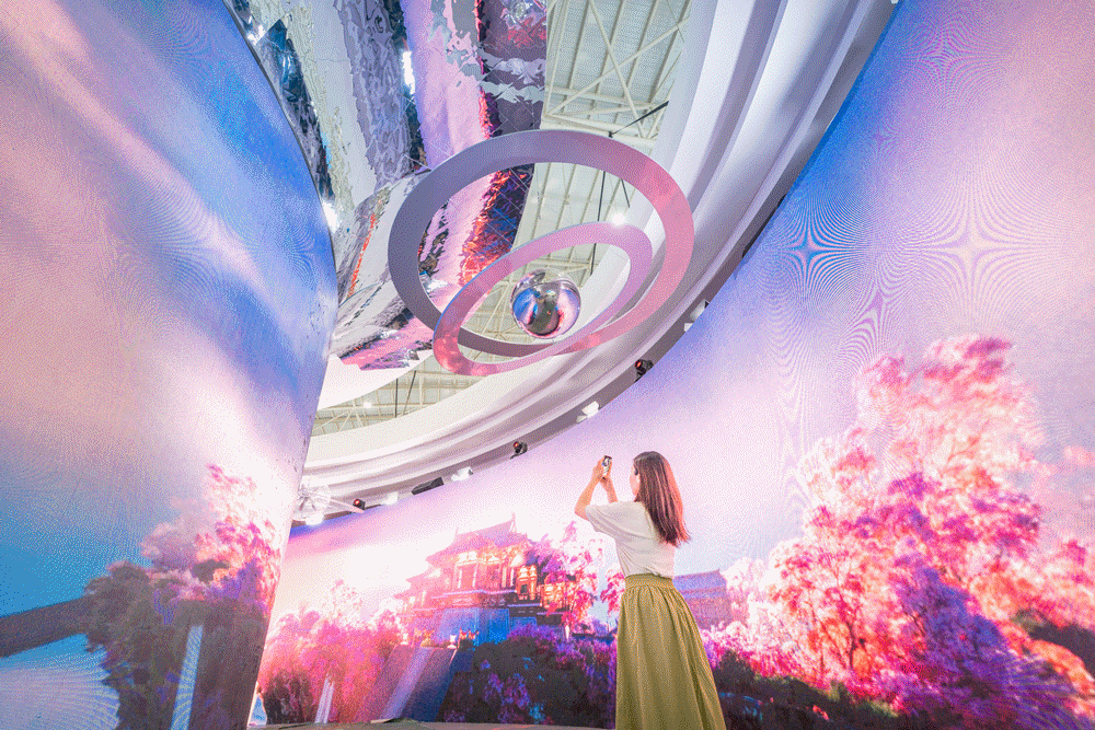 最出片的打卡点,位于武汉馆中央的第二空间——未来科幻的“无限之镜”:这是一个元宇宙万花筒艺术空间,现场再造真实的万花筒场景,银色黄鹤楼倒置悬浮半空,置身其中,如同进入奇幻梦境。