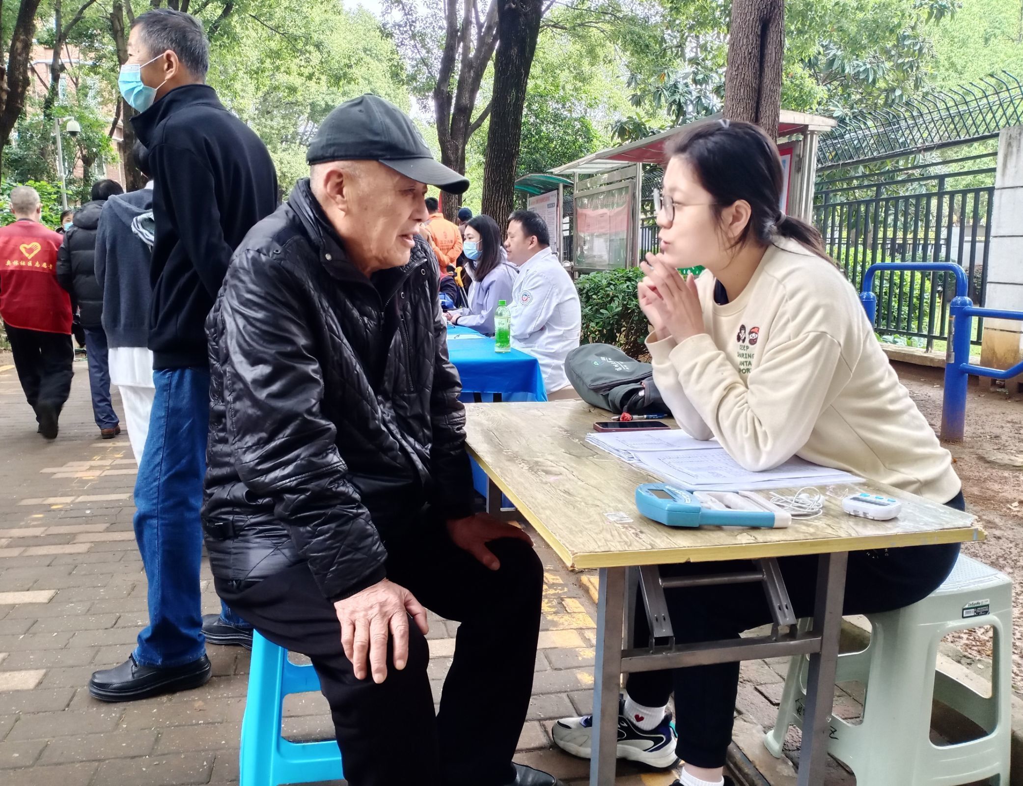 “奶奶,您不要急,慢慢跟我说,我先帮您量下血压。”在义诊区,医护人员通过“拉家常式”的问诊方式,耐心细致地询问病情,有条不紊地为他们量血压、测血糖、指导正确规范用药,并使用立体动态干扰电治疗仪为有脊椎病、神经痛、扭挫伤等困扰的居民缓解疼痛、改善血液循环。