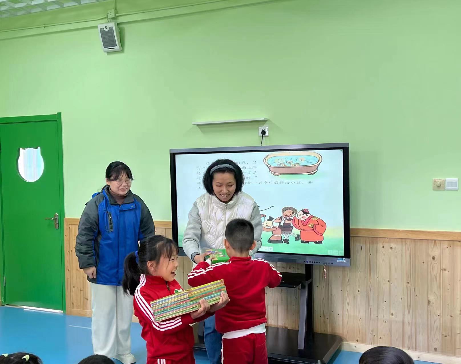 志愿者和小朋友互相分享故事,社区志愿者汪阿姨带来杨震太守公正廉明、“四知拒金”的故事,提问环节,小朋友们踊跃抢答,纷纷用稚嫩的语言说出自己的感受和收获。幼儿园小朋友代表江同学则绘声绘色地讲述了包公审石头的故事,赢得阵阵掌声。社区将廉洁绘本读物赠送给幼儿园,倡导小朋友“爱读书、读好书、看廉书”。