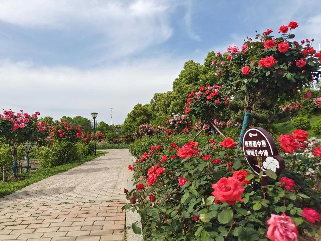 公园月季园位于公园东区,占地约5000㎡,月季园中有树状月季150余株,开花最为耀眼艳丽,花姿璀璨夺目,每株树状月季花朵近80朵,每朵花朵直径20公分左右,足有碗口粗。美丽的花瓣、淡淡的香味和优雅的风姿,都让人陶醉其中,仿佛将春天的美好尽数地展现在眼前。园内还有大红帽、金凤凰、绯扇、蓝月等品种灌状月季和藤本月季近1000㎡、25000余株,每株月季花枝丰富,花朵璀璨,平均开花近40朵,盛花期整个月季园呈现出上百万朵花的海洋。