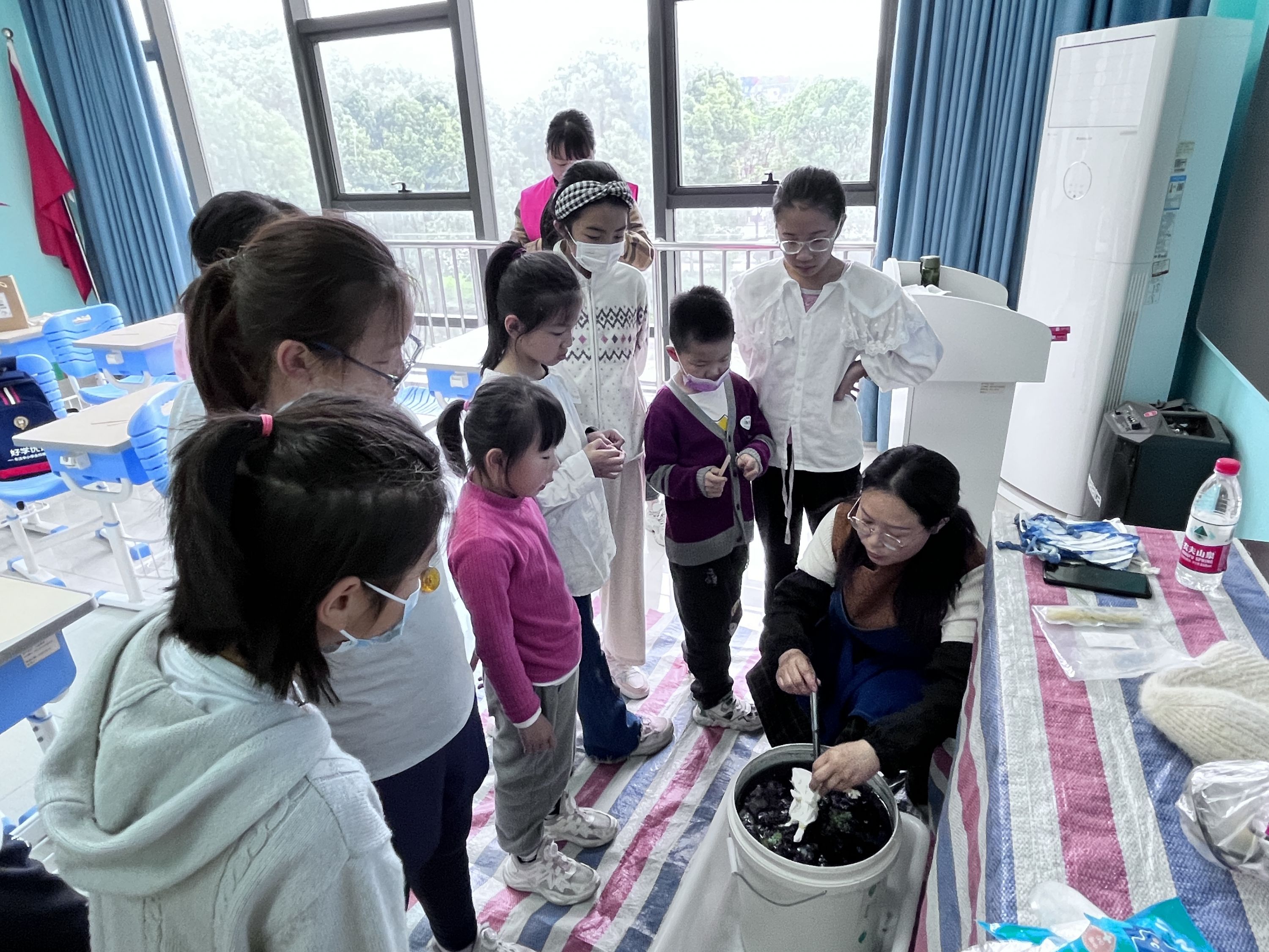 在掌握了基本制作要领后,小朋友们化身非遗文化的“传承者”,用线和夹板对织物进行扎、夹、打结等形式组合后,将织物放进染缸中染色。看着一张张平平无奇的布,经过设计与独特的扎染技法,变为一件件工艺作品,小朋友们真切感受到了扎染的魅力。