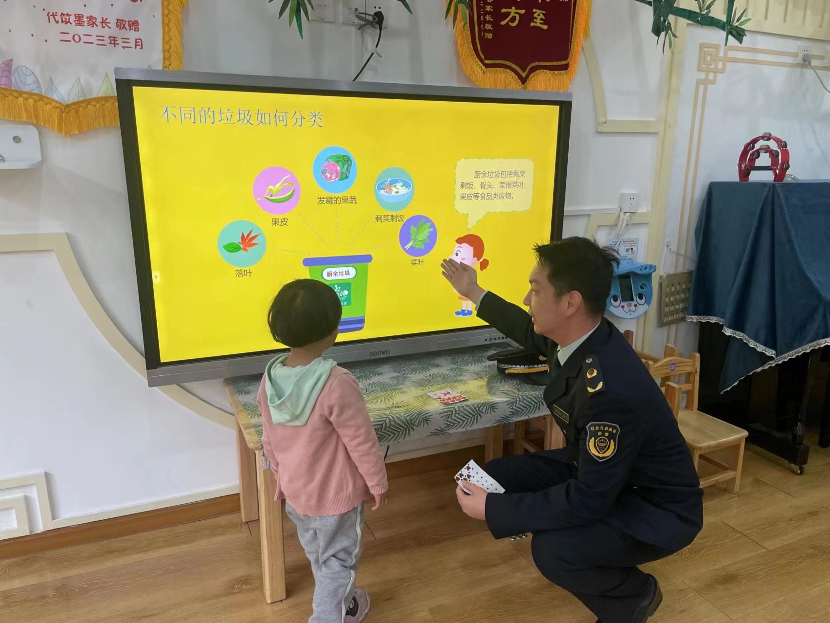 车谷融媒4月29日讯 4月27日下午,纱帽街道综合执法中心的执法队员走进晨曦幼儿园,为老师和小朋友们宣讲生活垃圾分类知识,传播绿色环保理念。