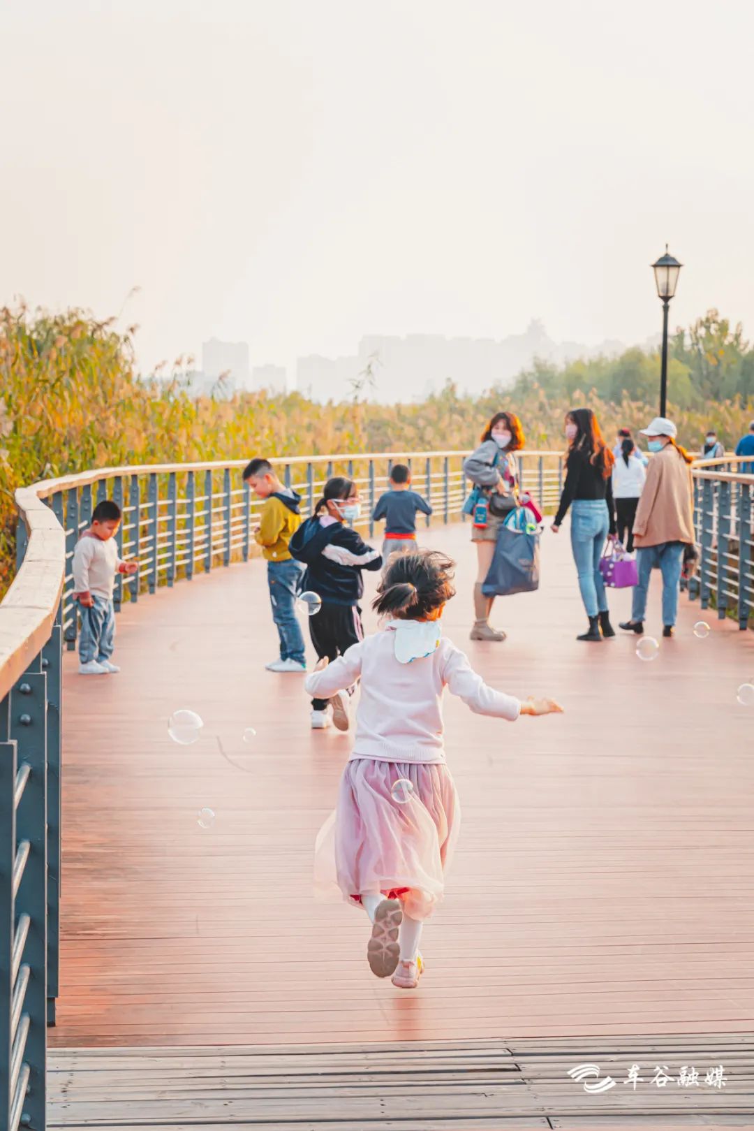 沿着木质栈道漫步,眼前全是满眼的湖畔芦苇、菖蒲等水生植物,耳边是家人们的嬉笑声,自然之美和天伦之乐共聚这方天地。