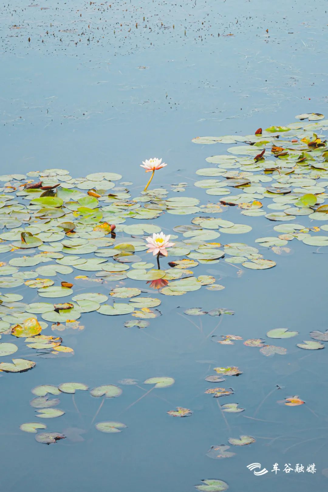 但不论东西,近岸水中种植着随水轻摇的水草,步道被芦苇、水竹芋等水生植物包围,最惊喜的还有这个时节依旧绽放的荷花。