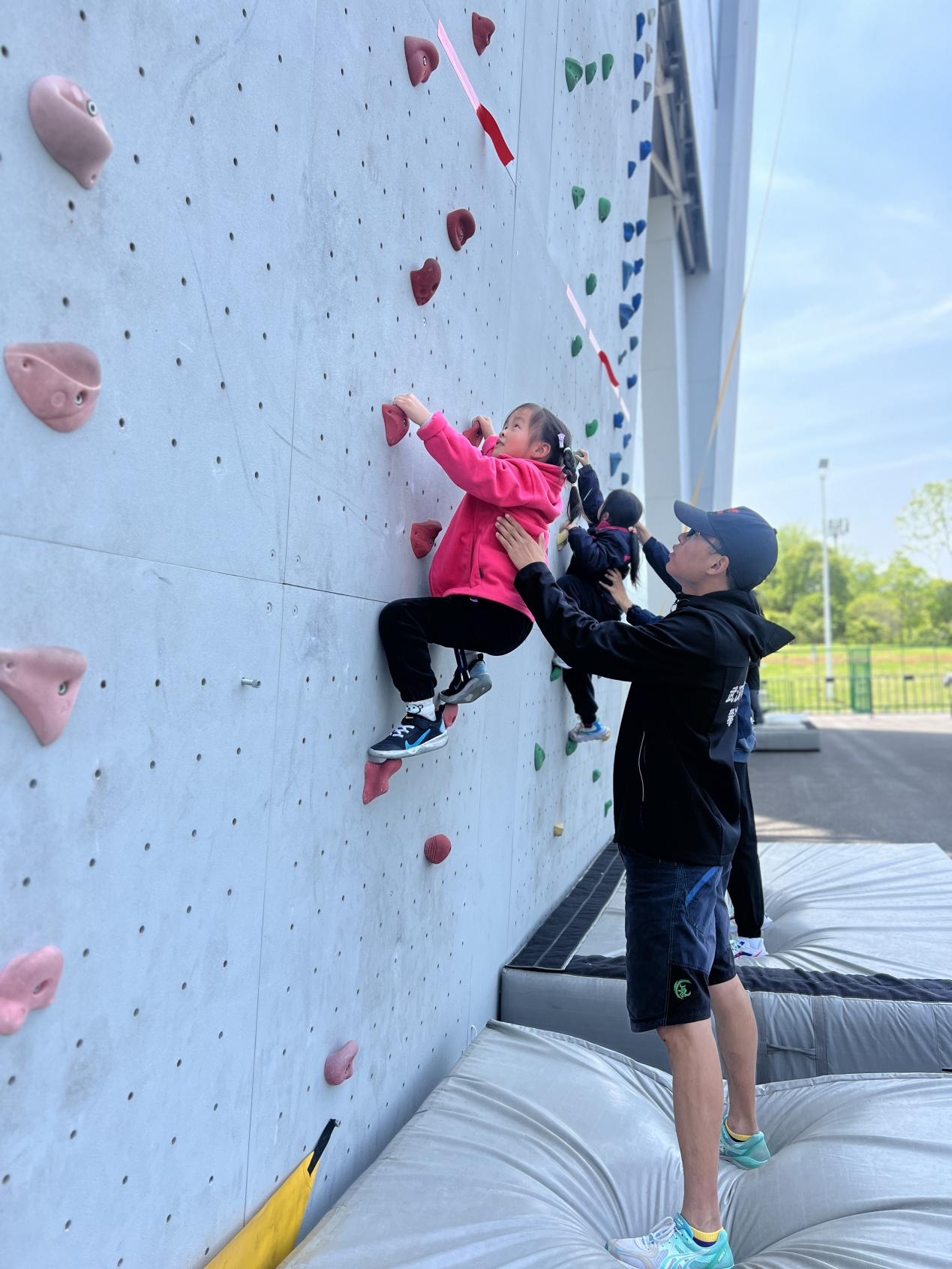 看到教练在巨型WH攀岩墙上下自如,孩子们发出敬佩的赞叹。岩壁上的行走不同于平地,它对平衡性有很高的要求,“三点不动一点动”,这对一年级的小朋友来说是个不小的挑战。通过教练的细心指导,孩子们在反复尝试中逐渐摆脱了对高空的恐惧,找到了身体的平衡和上升的节奏,一步一个脚印向上攀登,最终在小伙伴们的欢呼下成功登顶。