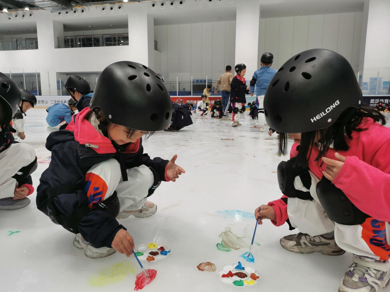在教练和老师的带领下,孩子们穿戴好护具,以华中地区最大冰上运动中心为画纸,开启了充满创意的冰上艺术之旅。大家用画笔饱蘸各色颜料,在冰面上肆意挥洒创意,画出了自己的奇思妙想。一双双小手创造的图案,在晶莹剔透的冰面上看起来更加鲜艳新奇,整个冰场飘荡着银铃般的笑声。