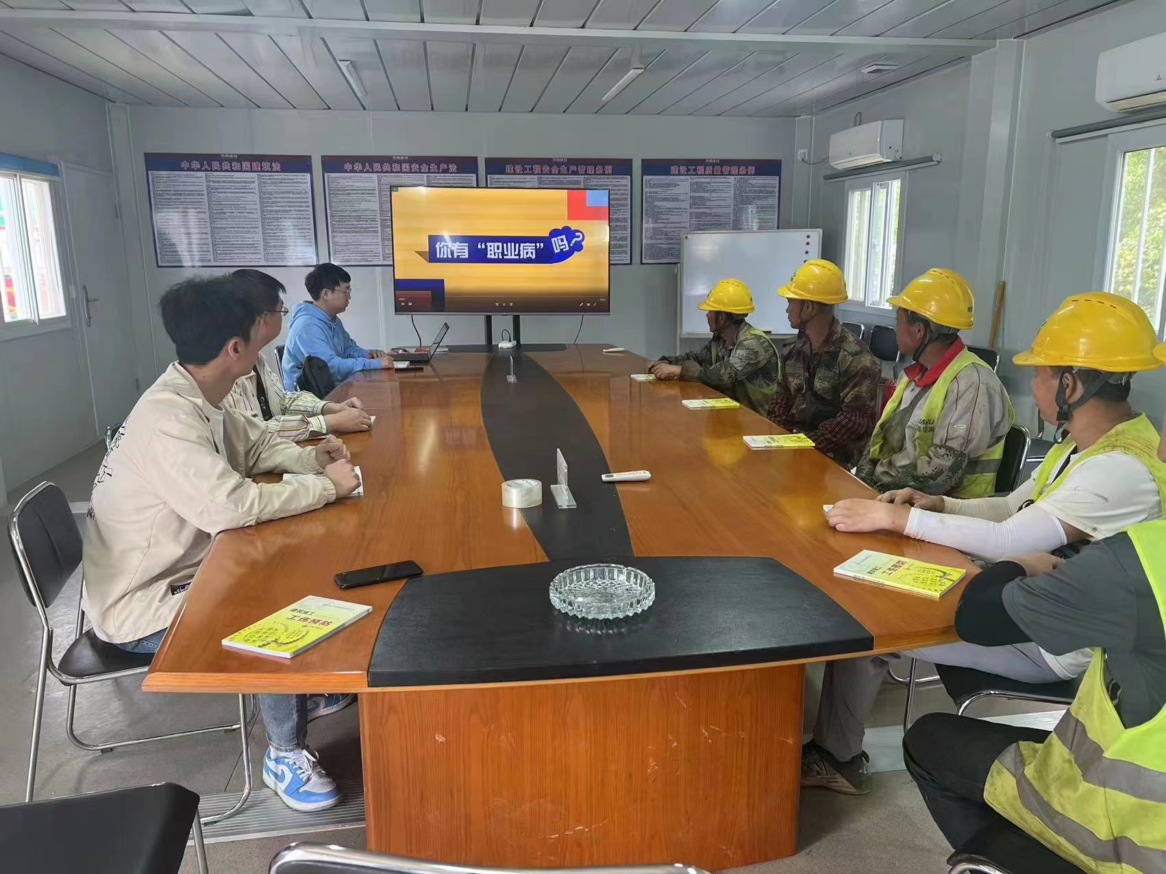 宣传活动主要采取悬挂宣传横幅、召开座谈会、组织职业卫生专题培训等方式,通过对职业卫生法律法规的解读、现场作业的注意事项、日常职业卫生工作重点等方面进行诠释,并向项目管理人员及建筑工人发放《职业病预防手册》60本。
