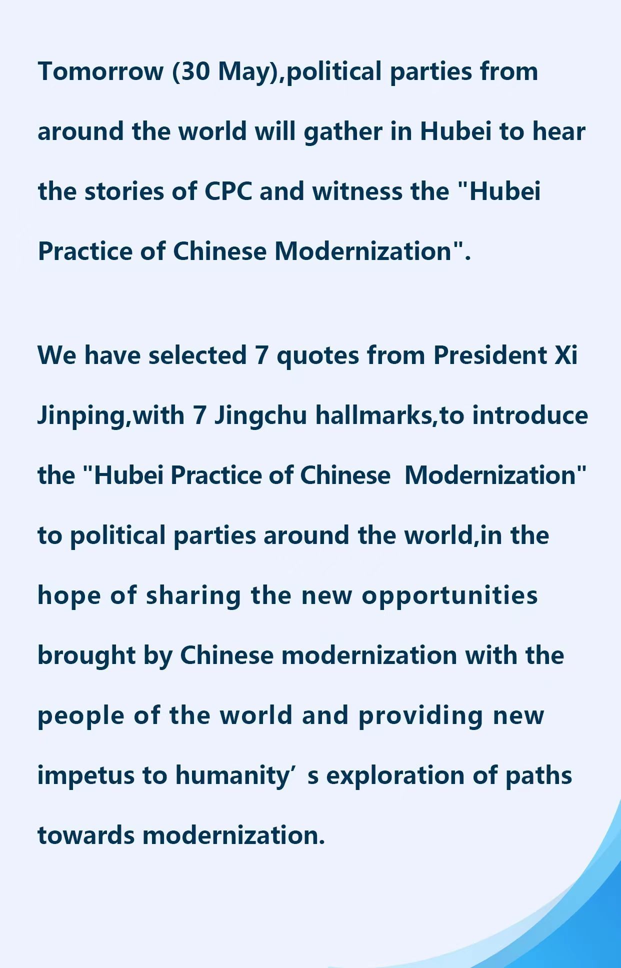 我们精选习近平总书记的7段话,配以7张荆楚名片,向世界各国政党介绍“中国式现代化的湖北实践”,希望与世界人民共享中国式现代化带来的新机遇,共同为人类探索现代化道路提供新助力。