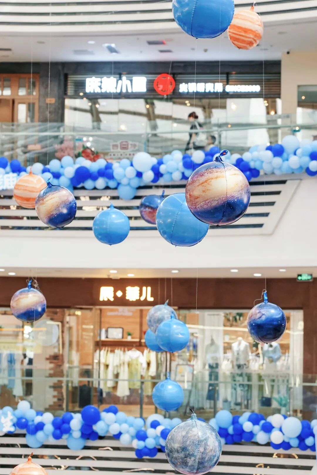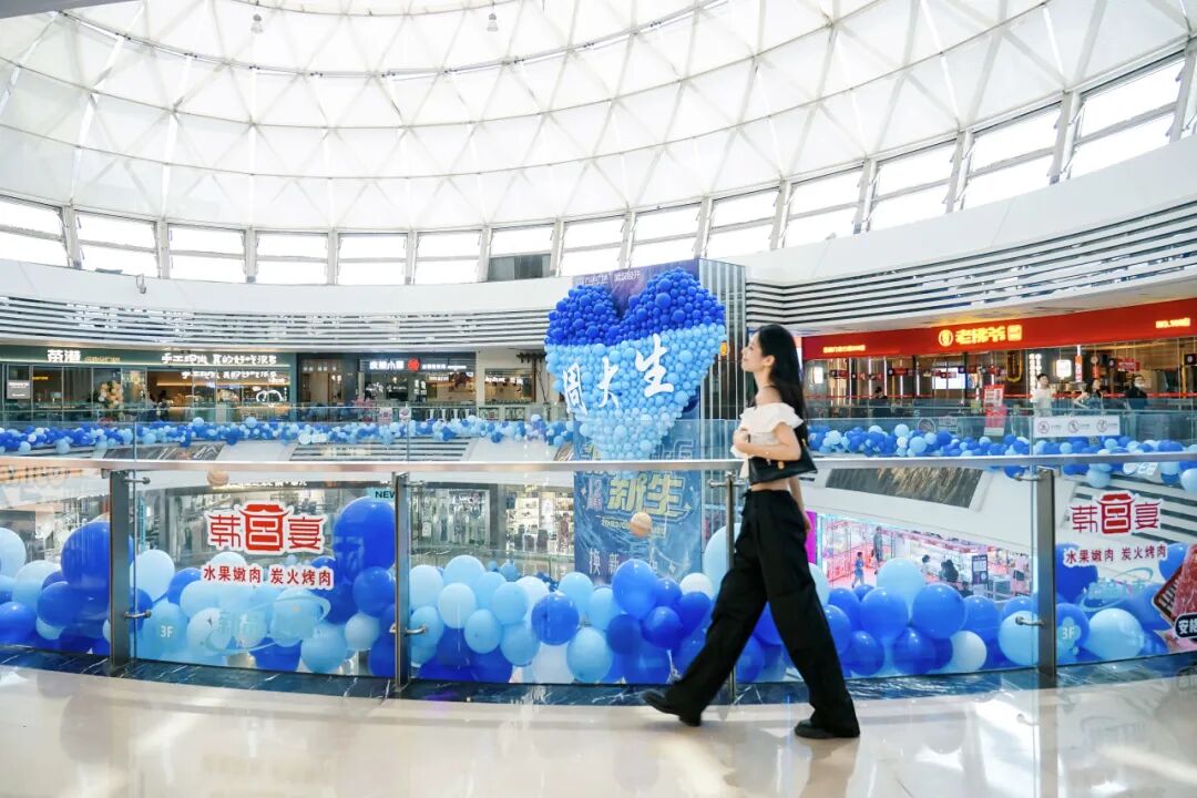 四周环绕深浅不一的蓝色气球,则是飘荡在每层楼层之间,天空之下,温柔而明亮,宛如绽放的礼花送来一个又一个美好祝愿。
