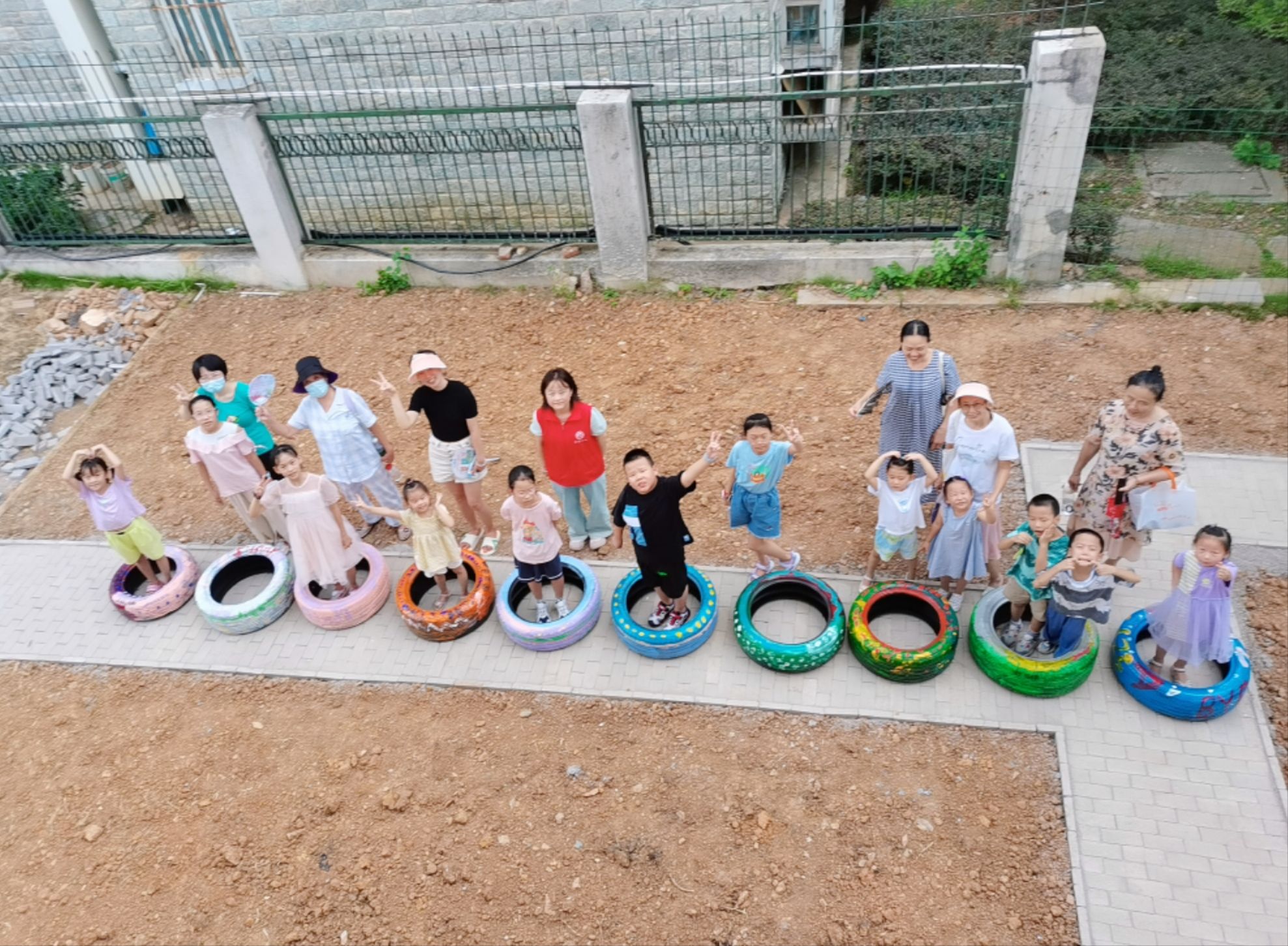 大家还齐心协力把轮胎放到绿色驿站的花园,将它们穿上麻绳、摆好造型,为花园新添一道亮丽的风景线。