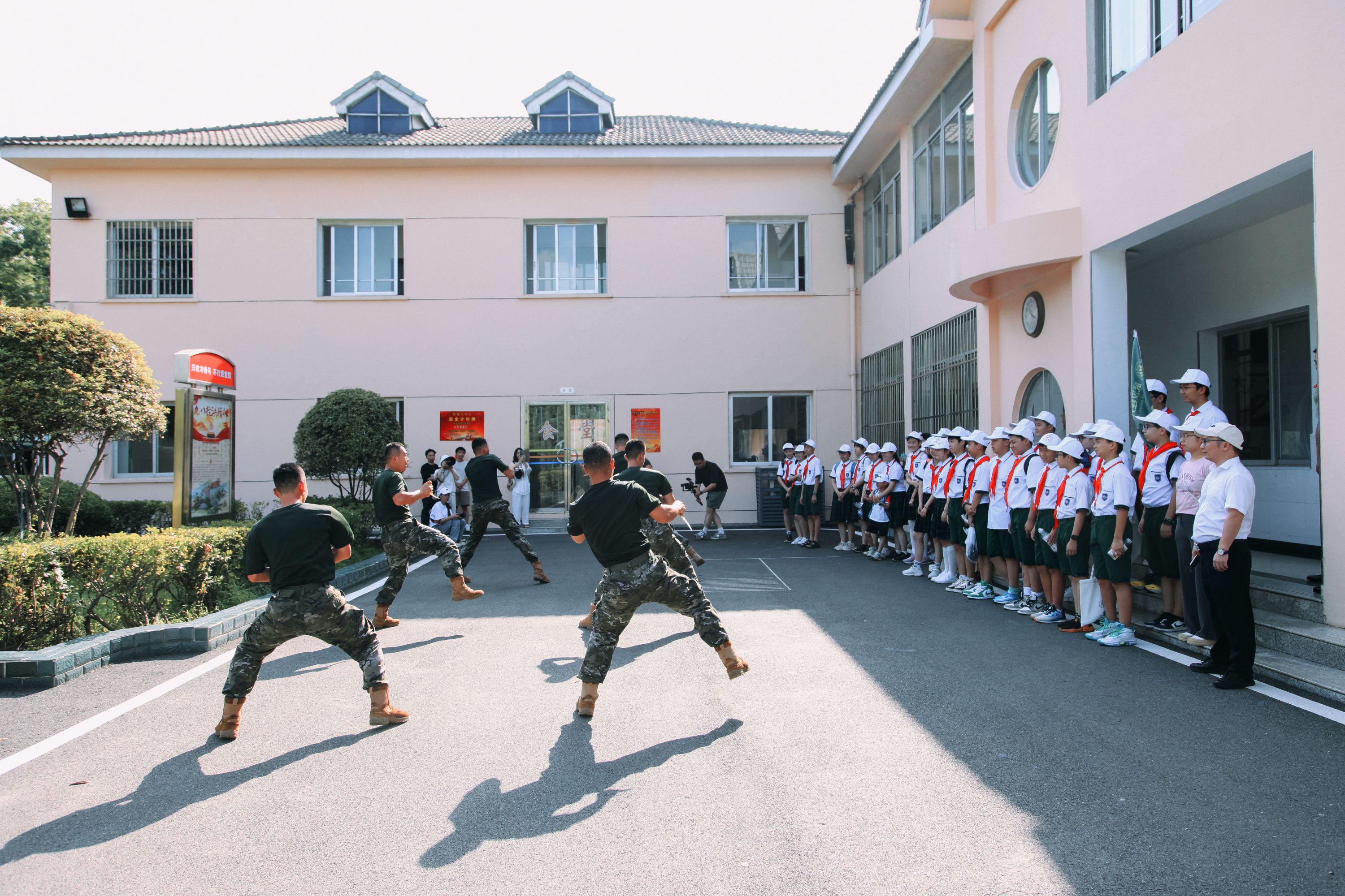 在国防教育活动环节,学生们现场观看官兵的匕首操,擒敌拳,激情活跃的匕首格斗实操、整齐划一的擒敌拳演练,无不传递着官兵们严于律己的日常。