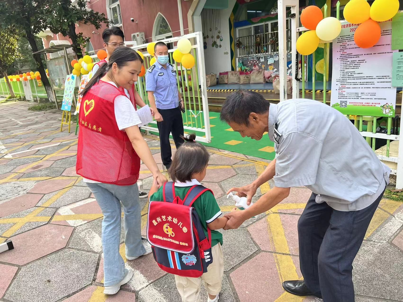 车谷融媒8月31日讯 日前,沌阳街道海滨城社区联合沌阳派出所、社区党员、志愿者齐心合力,在星兴艺术幼儿园校门口开展“暖心护学岗 全员在行动”护学活动。
