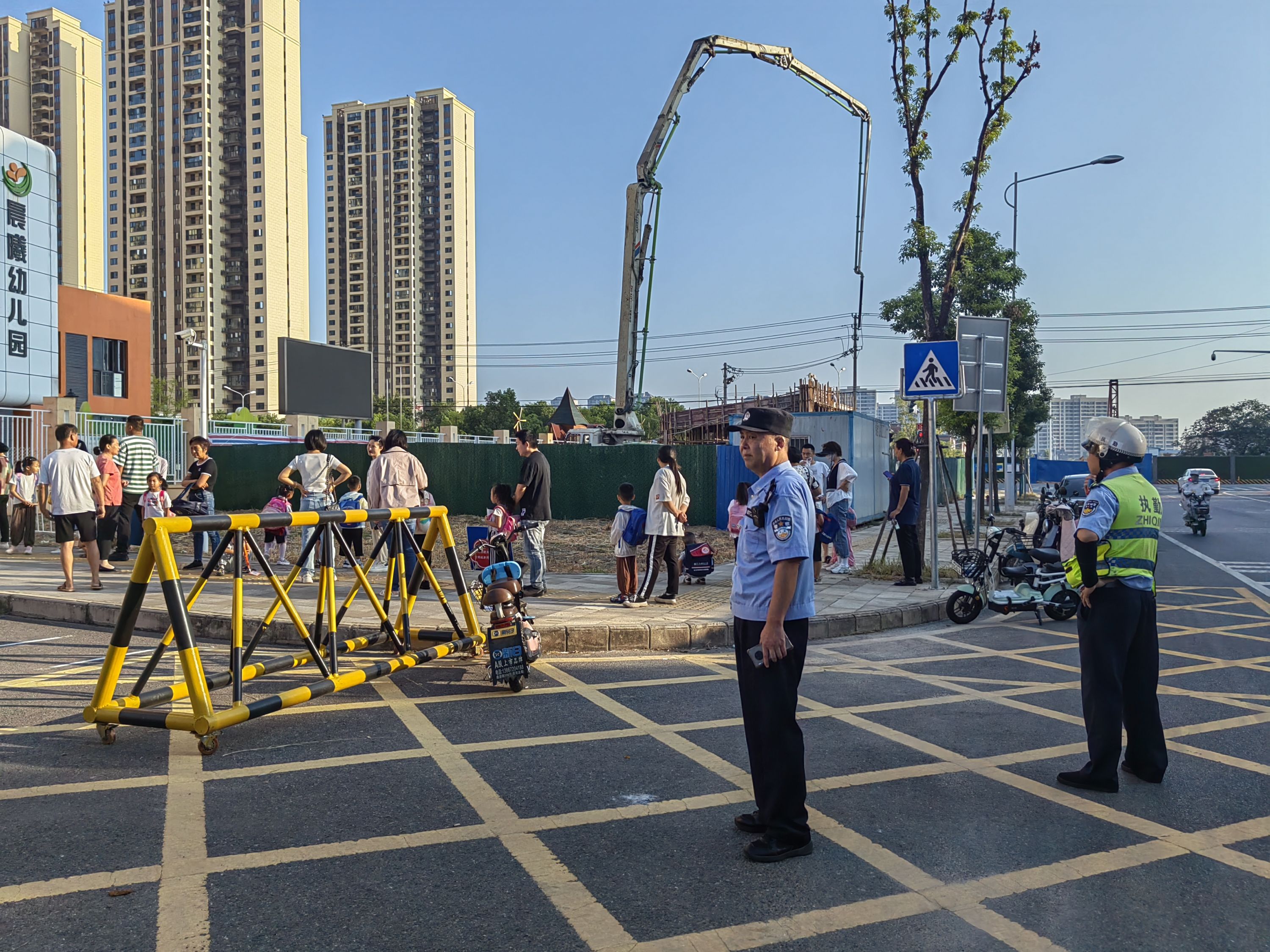 护学民警连同社区工作人员对幼儿园周边接送车辆进行有序疏导,劝导送学车辆“即停即走”、指导非机动车辆规范停放,确保道路畅通。在社区工作人员的帮助下,校门口秩序井然。
