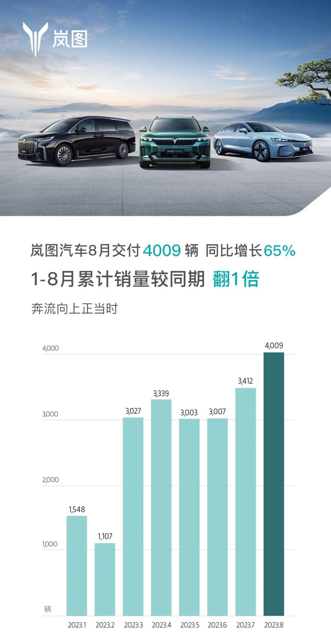 今年前8个月,岚图汽车累计销量较去年同期翻番。岚图汽车CEO卢放表示,在品牌成立三周年之际,岚图汽车销量稳中向好、创下历史新高,品牌的市场认可度和影响力再上新台阶。