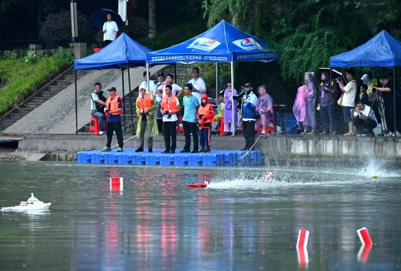 贡水河上,一艘艘色彩绚丽、造型各异的航海模型在指定水域如离弦之箭疾速飞驰,溅起一片片晶莹的水花,上演着水上的“速度与激情”。