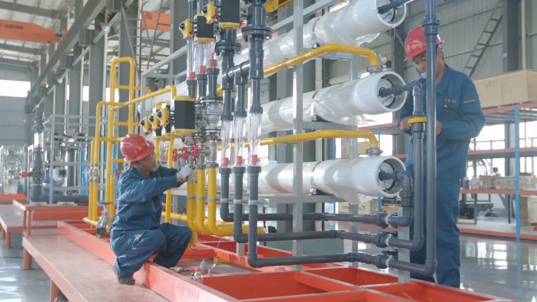 ▲天源环保的工人们正在对高难废水处理设备进行安装调试。通讯员供图