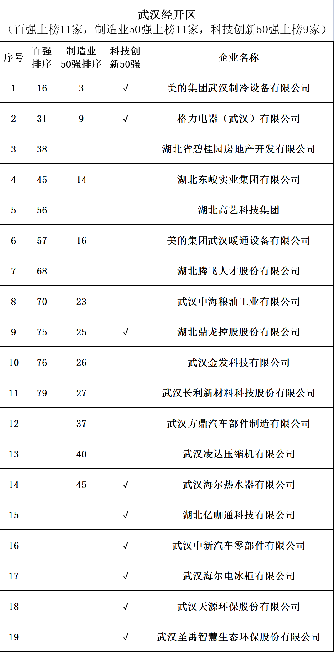 8月28日,武汉发布“2023武汉民营企业100强”“民营制造业企业50强”“民营企业科技创新50强”名单,武汉经开区19家企业入选。