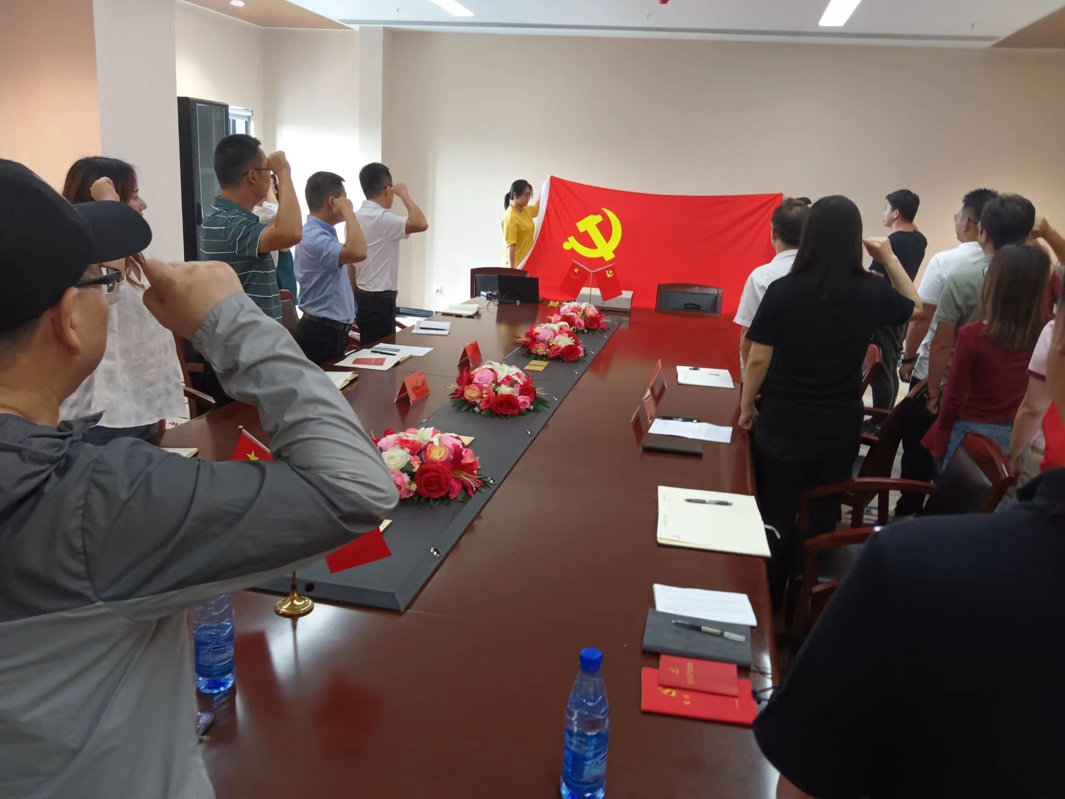 在学校党建会议室,全体党员面向党旗,右手举拳,重温入党誓词,开展集中学习。