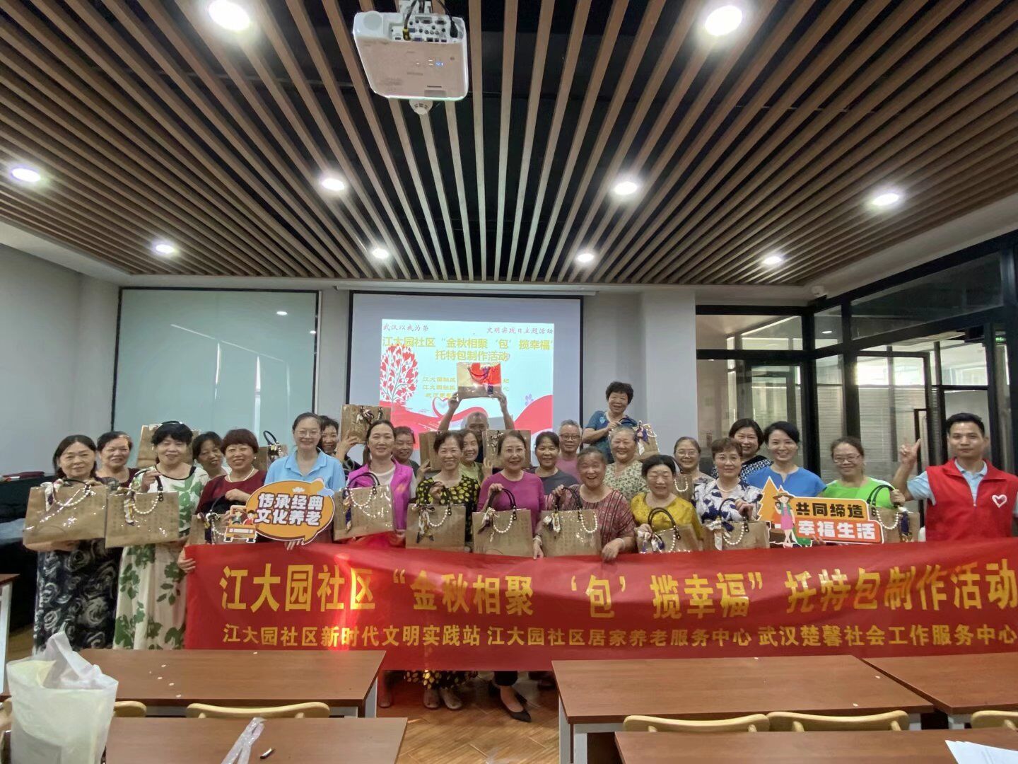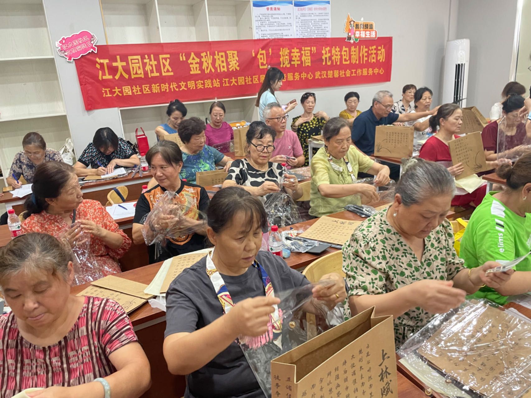 车谷融媒9月18日讯 9月15日,沌阳街道江大园社区新时代文明实践站联合武汉楚馨社会工作服务中心开展“金秋相聚,‘包’揽幸福”托特包制作活动。