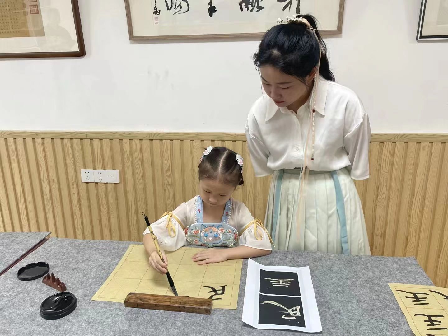 在汉字书写展示环节,13位身穿校服的同学拿起毛笔洋洋洒洒写下社会主义核心价值观,并向居民们展示成果。