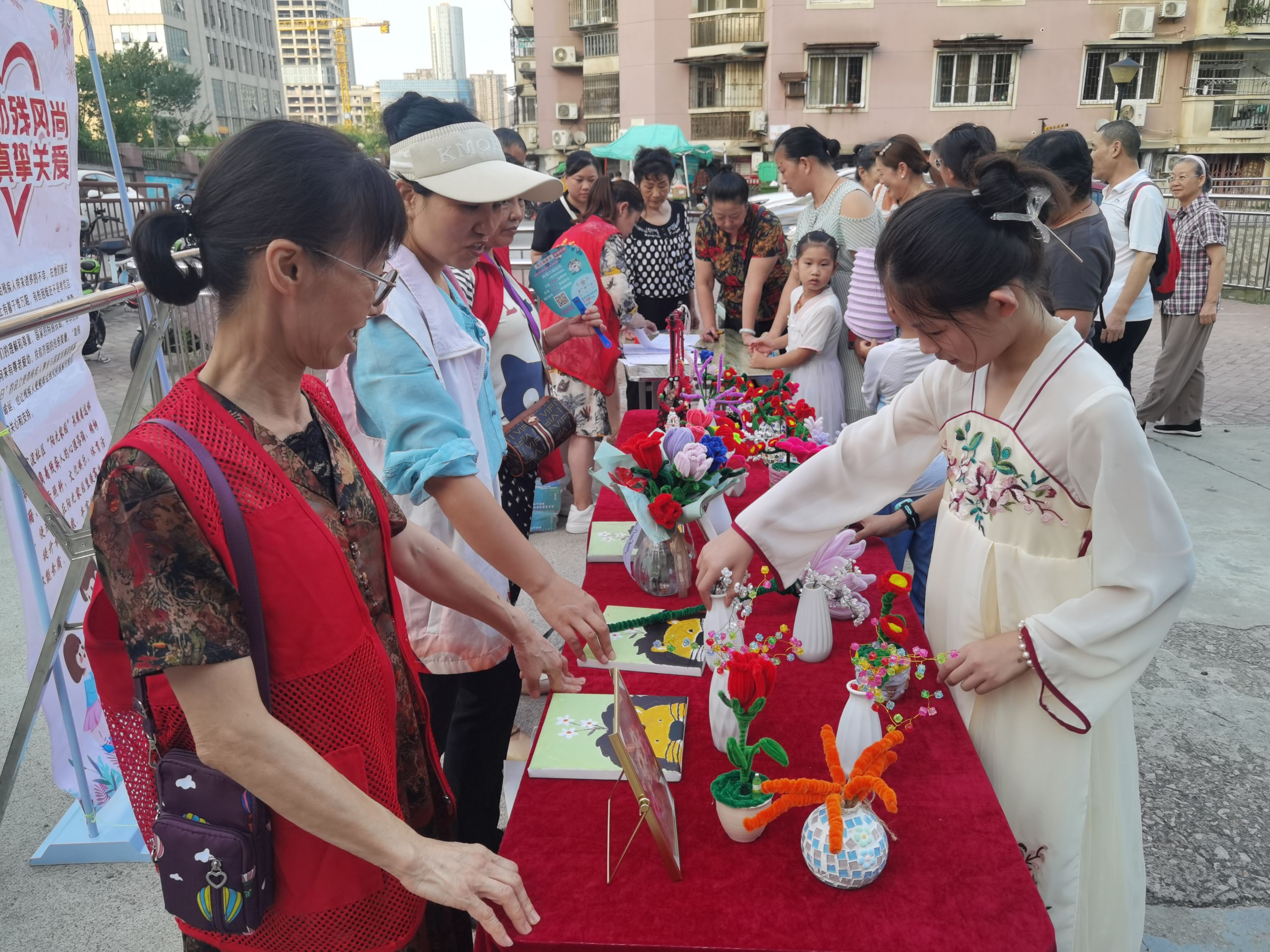 在精神文明宣传区,摆有社区公益基金募集宣传,还有来自社区阳光家园的残疾人们制作的手工义卖活动。