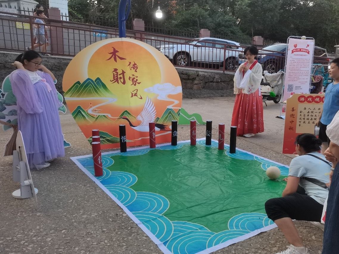 主题打卡拍照区,居民们携家人在打卡区拍照留念定格幸福时刻;游戏互动区,既有中秋传统节目猜灯谜、投壶,又有充满童趣的玉兔套月饼,还有家风传承的传统木射等精彩纷呈的游戏,这些互动游戏集运动、益智、反应能力和传统娱乐为一体。