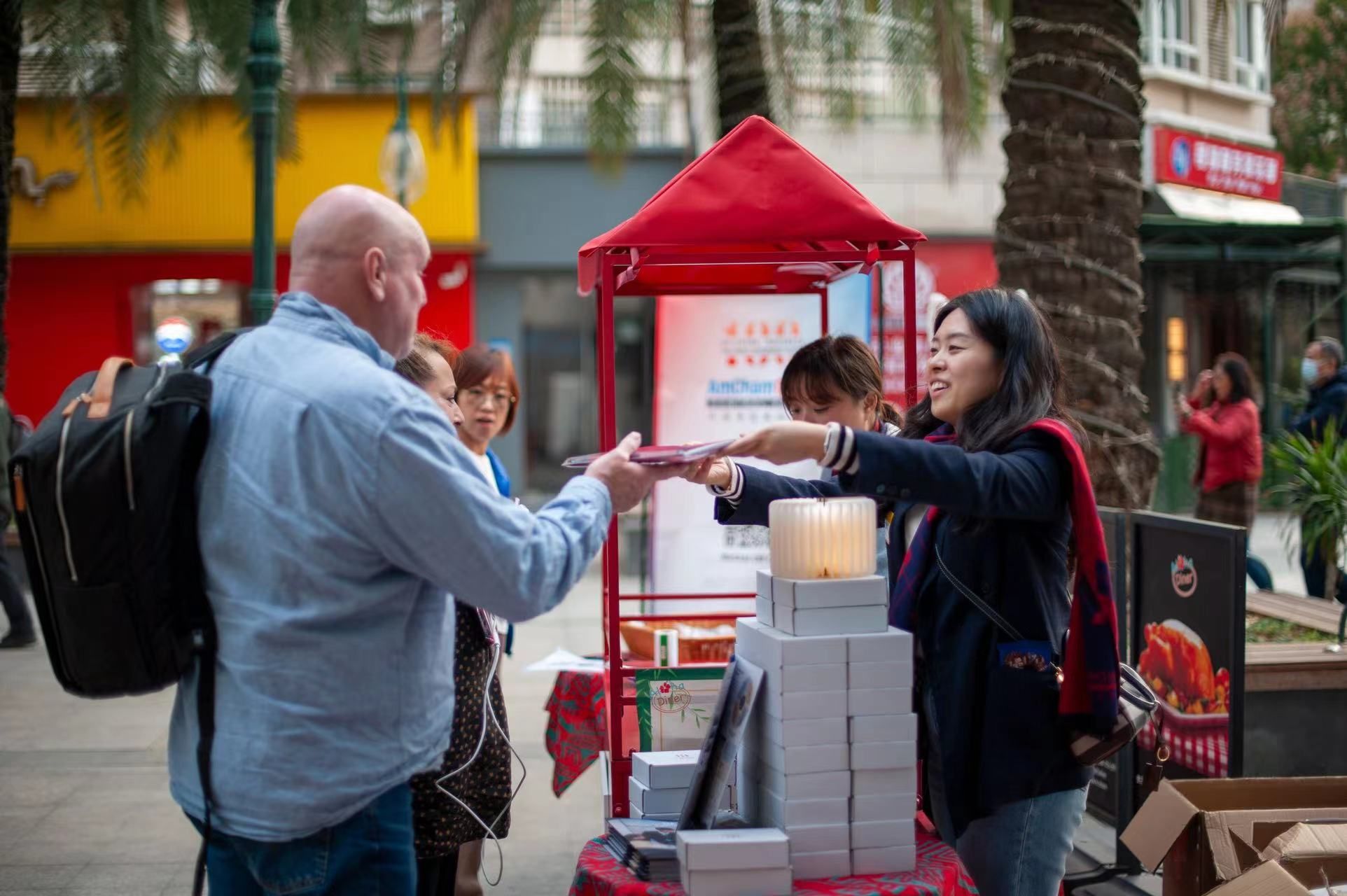 公益集市上,工作人员向外籍人士发放纪念品。