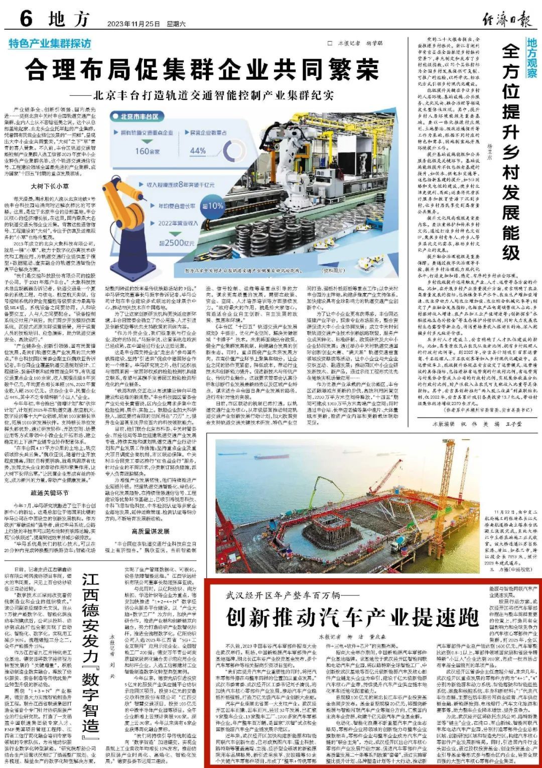 11月25日,《经济日报》6版刊发报道《武汉经开区年产整车百万辆 创新推动汽车产业提速跑》,聚焦武汉经开区发力新能源与智能网联汽车新赛道,加快汽车核心零部件产业发展,推动汽车产业稳链补链强链,奋力打造车谷产业创新大走廊的生动实践。以下为全文转载。