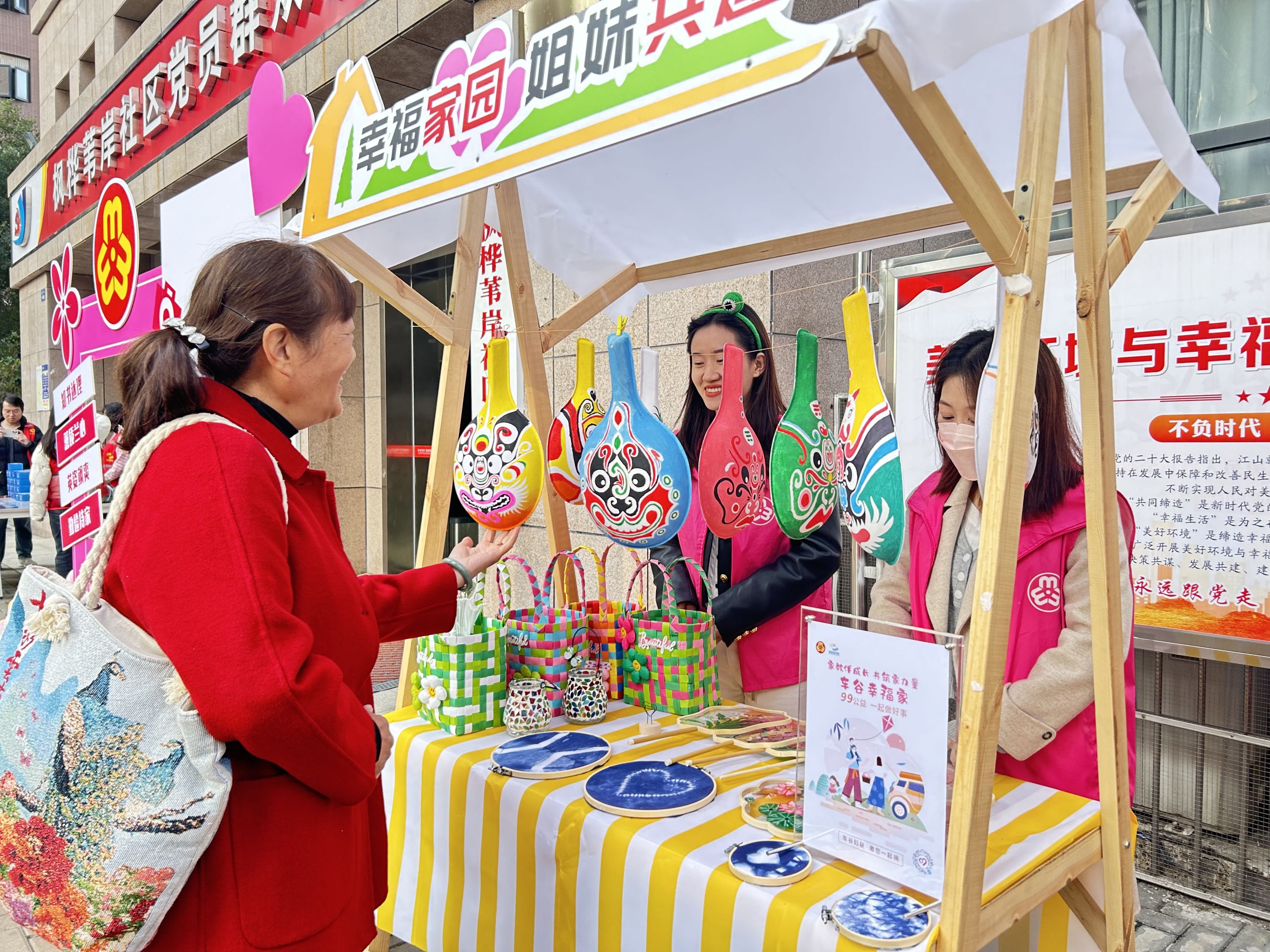 睦邻义卖摊位区展示、销售着由睦邻艺社成员制作的手工艺品、书法作品等,糖葫芦和非遗糖画摊位引得周边居民纷纷前来“赶集”。以糖为墨,以勺为笔,居民们欣赏着可以吃的画慢慢成形,甚至忍不住想要上手体验。