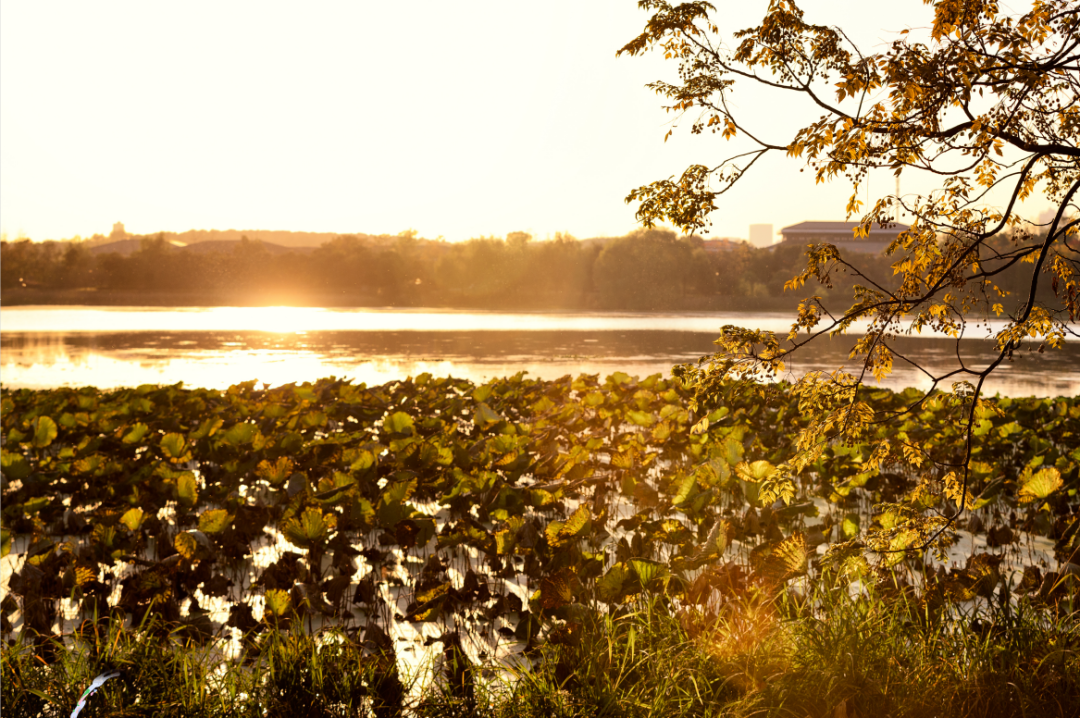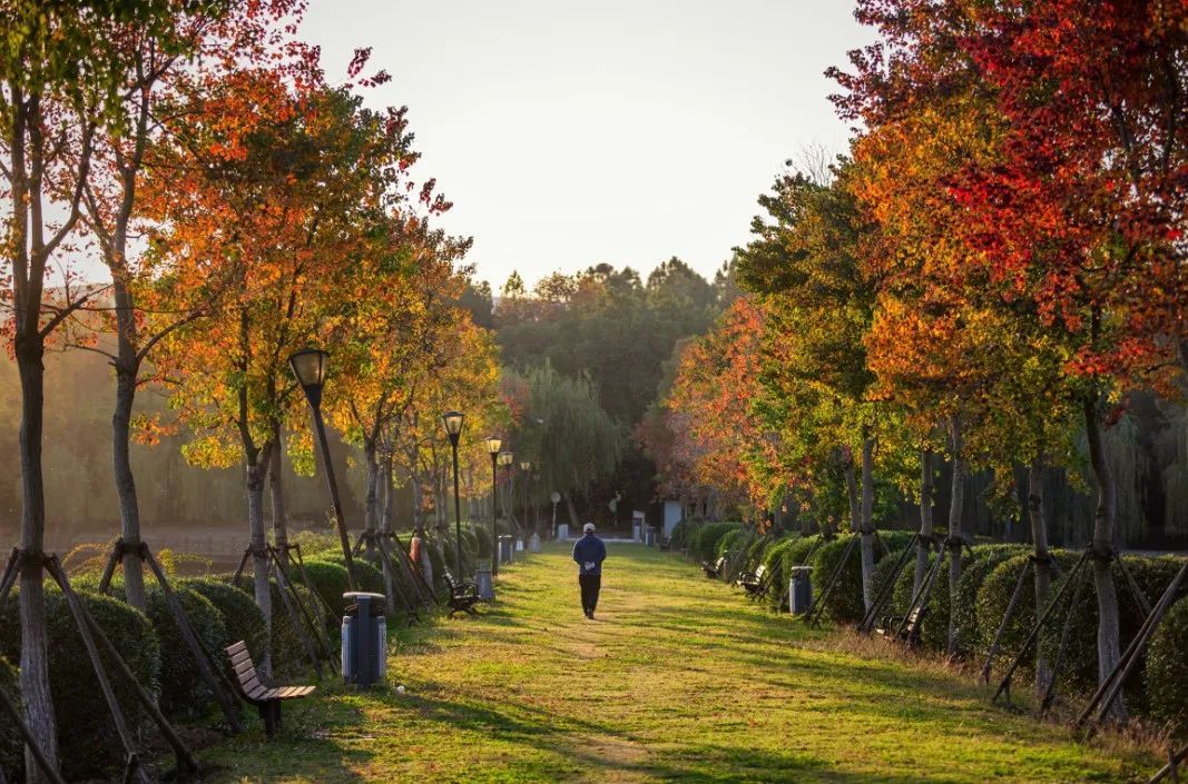 行至汤湖公园,满园绿植正绽放着秋天的色彩。