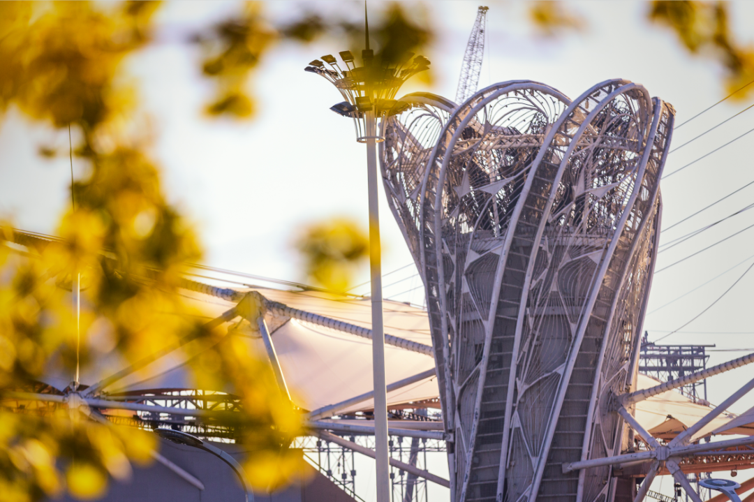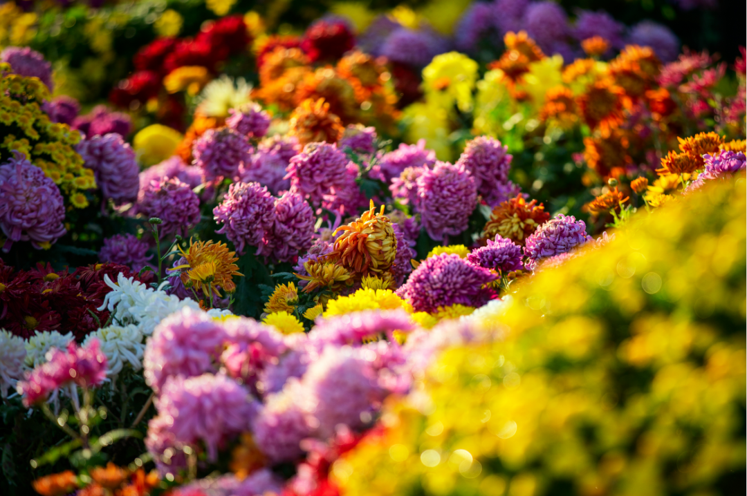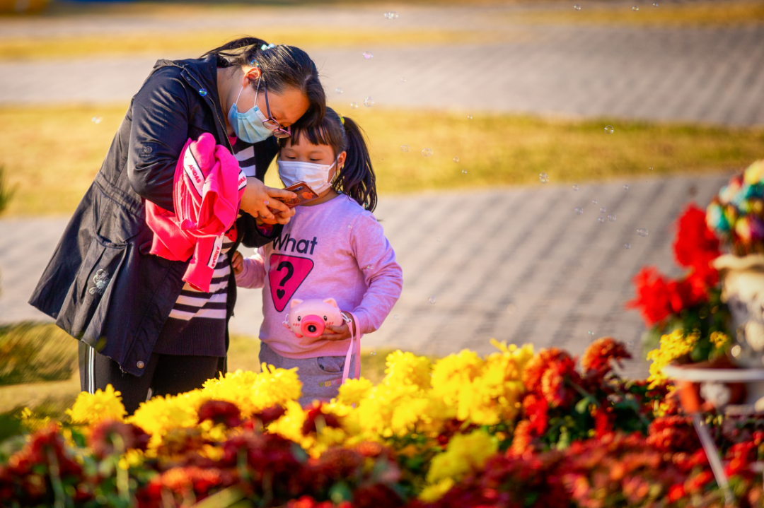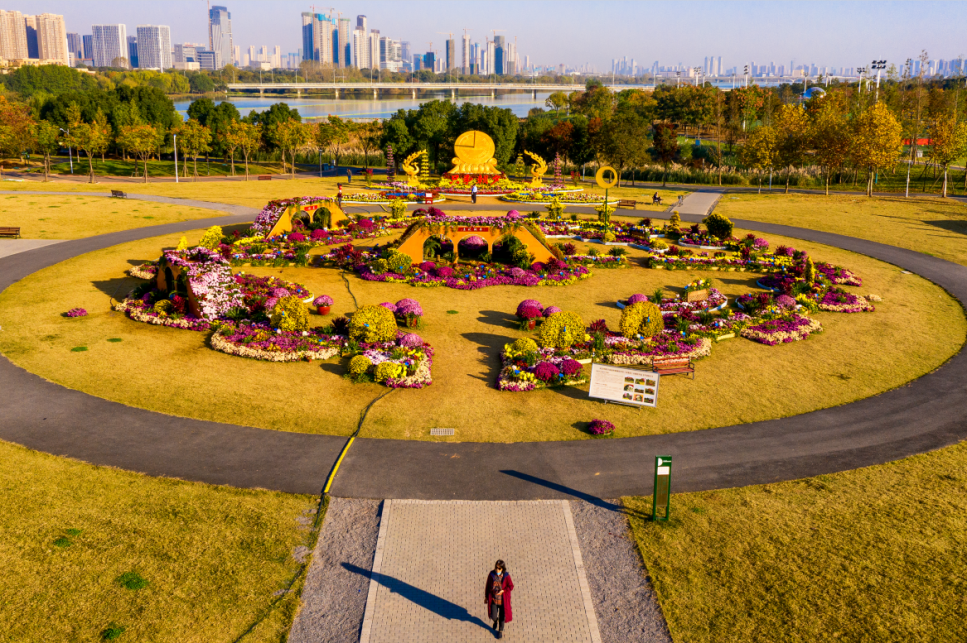 不远处的足球公园里,千万朵菊花正悄然盛开,将前来拍照打卡的游客们笼罩在温暖的金色光影里。