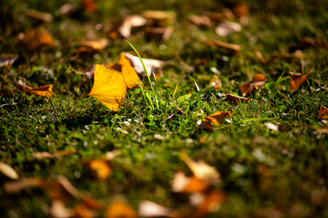 武汉体育中心道路旁的银杏黄了,群树随风起舞,扭动着身躯向青草地撒去一片金黄。
