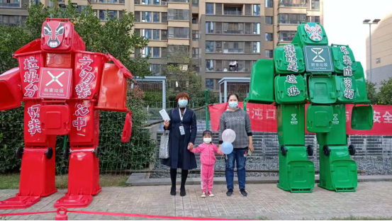 11月13日下午,沌口街同德社区广场上,四个由分类垃圾桶组装成的机器人格外显眼,吸引居民朋友们纷纷与机器人打卡留念,记录这场充满趣味又有意义的活动。
