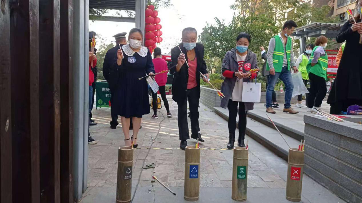 垃圾分类游戏区,沙包和投壶小游戏深受居民欢迎,大家在玩中学,学中玩,通过游戏,不仅锻炼了居民生活垃圾分类的能力,更让居民动起来,助力健康环保的生活方式。