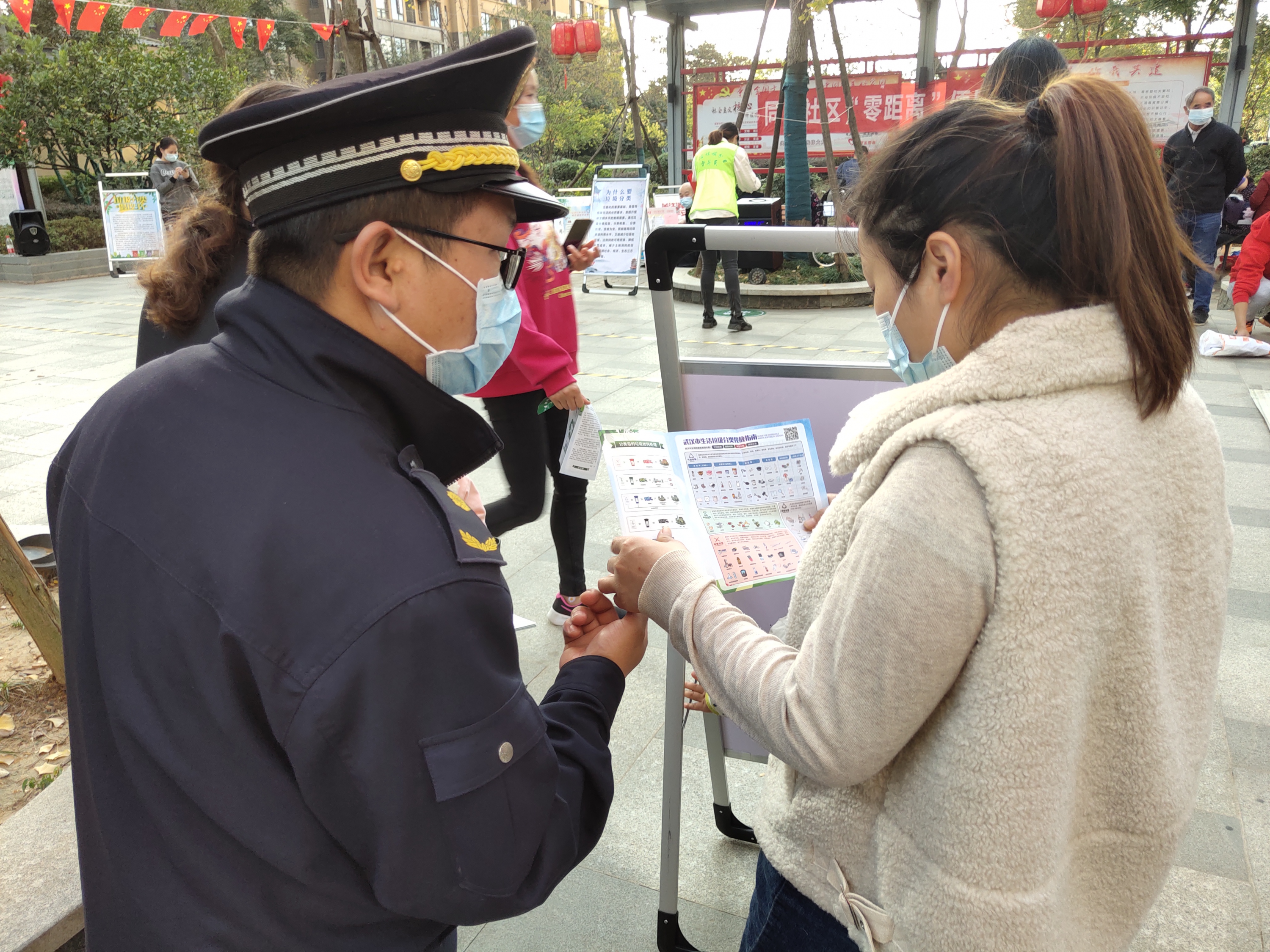 活动的另一边,沌口街城管中队、下沉党员与社区工作人员耐心地向居民群众讲解垃圾分类知识,现场发放垃圾分类、平安创建、精神文明、常态化防疫各类宣传资料500余份。
