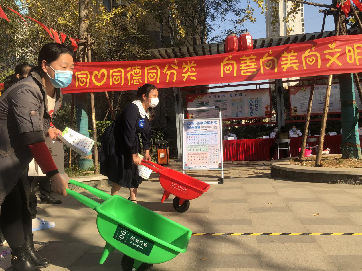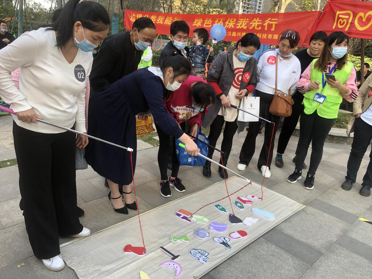垃圾分类闯关区,居民四人一组,代表着“红、绿、蓝、灰”四分类垃圾收集兵,齐心协力使用钓鱼竿将垃圾牌钓到正确的分类推车内,模拟集中分类和集中收集的过程,再穿过障碍物,利用垃圾车将“垃圾”运输到正确的垃圾桶内,模拟集中运输和集中处理的过程。