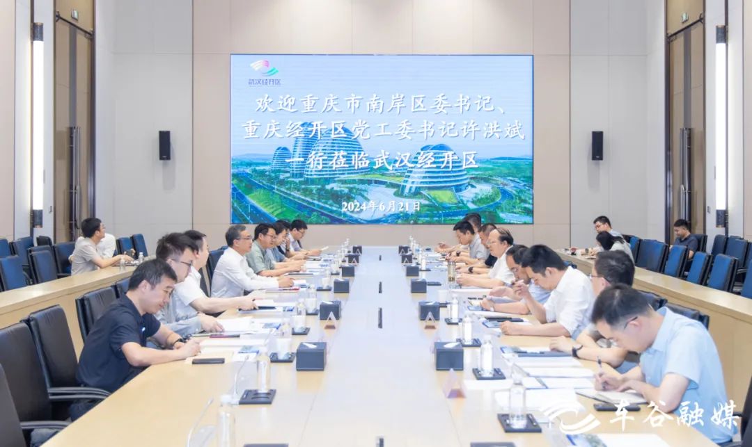 车谷融媒6月22日讯 6月21日,重庆市南岸区委书记、重庆经开区党工委书记许洪斌带队来武汉经开区考察。武汉市委常委、武汉经开区工委书记刘子清与许洪斌一行座谈交流。