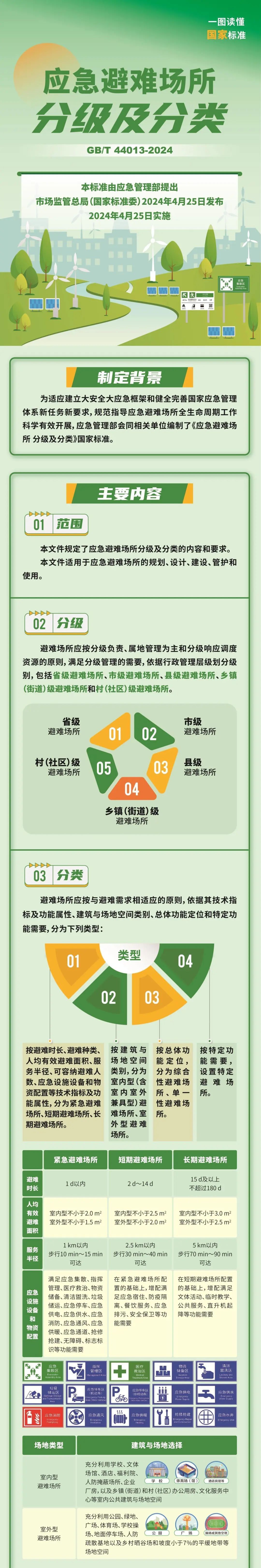 《应急避难场所 分级及分类》将全国应急避难场所划分为省级、市级、县级、乡镇(街道)级和村(社区)五级,同时为适应分类管理需要,进一步划分了室内型、室外型,综合性、单一性(含特定)和紧急、短期、长期避难场所,主要解决当前应急避难场所应对灾种单一、功能技术指标不统一,规划布局缺乏分级分类指导等问题。