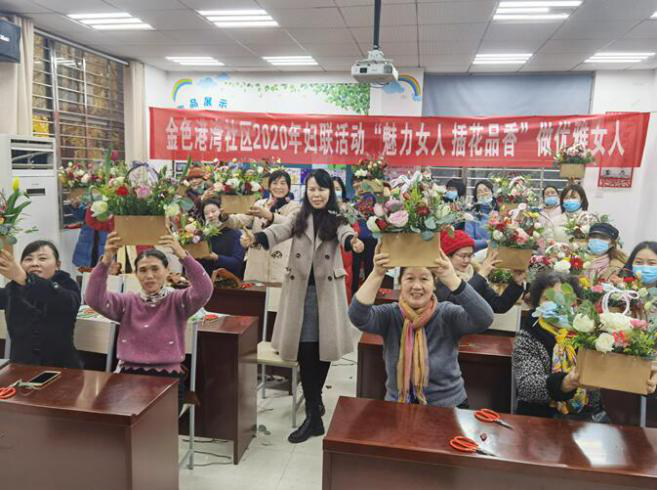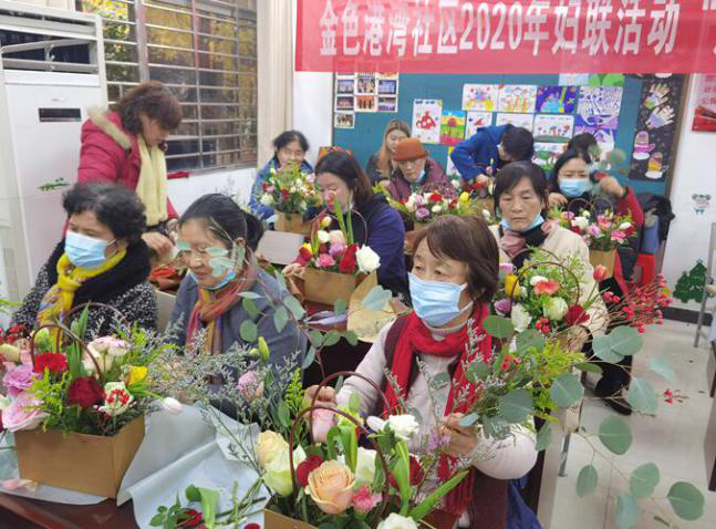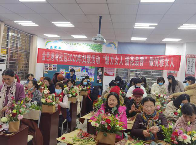 12月10日上午,金色港湾社区组织社区妇女开展了“魅力女人,插花品香”插花培训活动,邀请资深花艺老师为居民进行现场指导,30多名社区妇女参加活动。