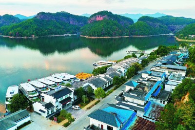 福建省三明市泰宁县大金湖畔的梅口乡水际村及游客码头。新华社记者姜克红摄