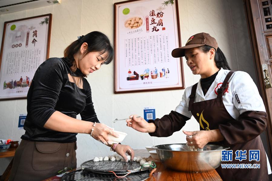 11月18日,在福建省三明市沙县文昌美食街,沙县小吃经营业者在制作滚粉豆腐丸。新华社记者 姜克红 摄