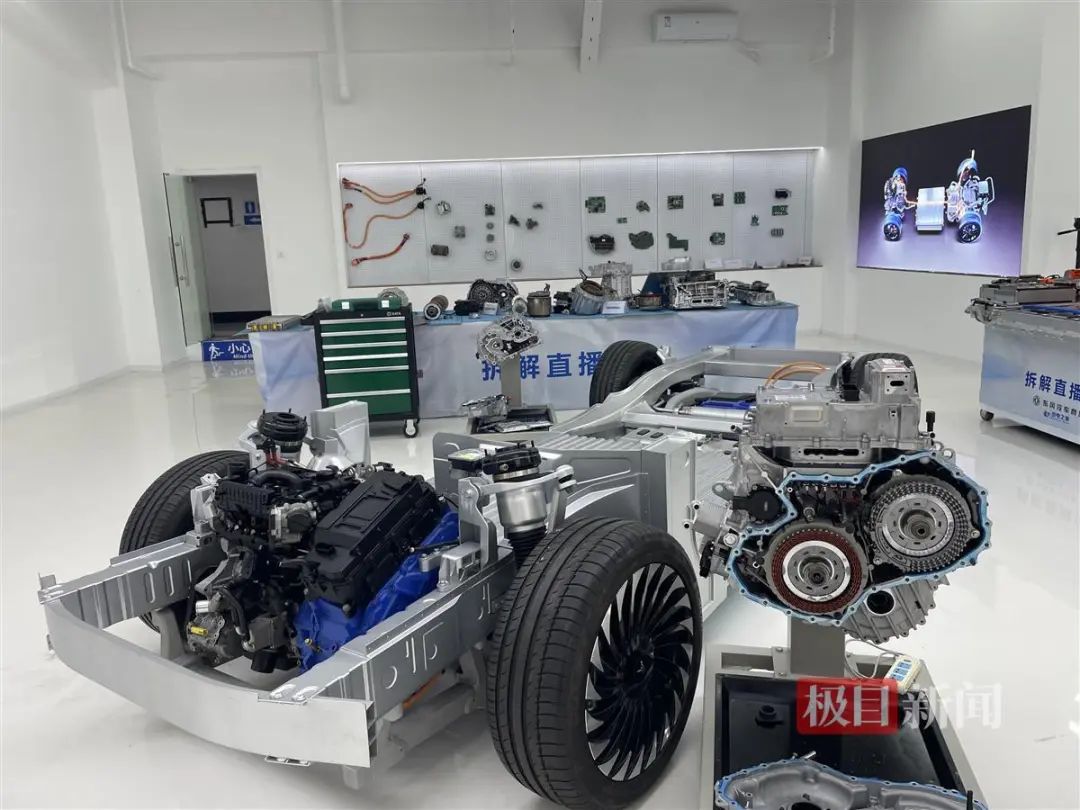 除了多款“车谷造”新能源汽车展示外,在车谷东风汽车商城直播中心大厅内,记者看到,这里设有拆解直播间,汽车零件拆解后摆放在此。